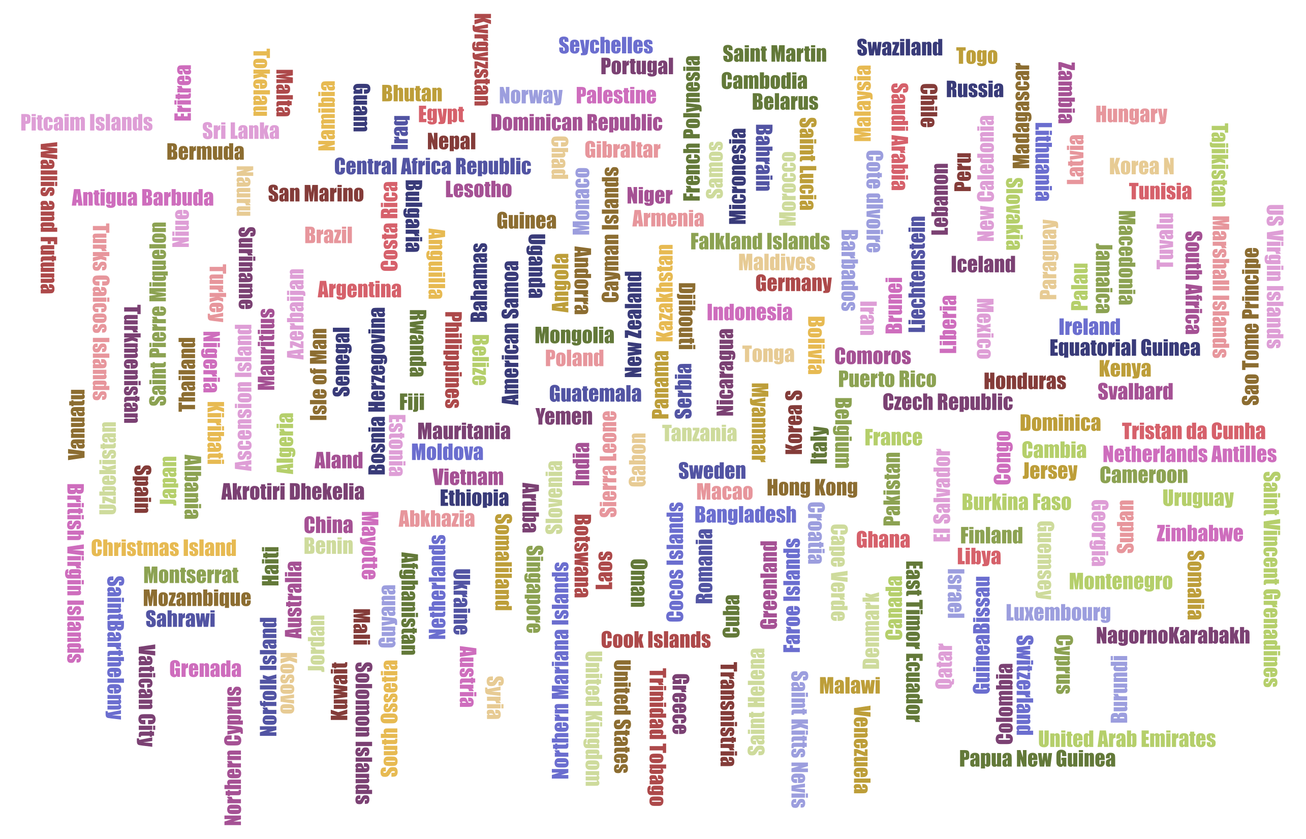 This is a word cloud made up of various countries' names. These countries are displayed in different colors, making the word cloud visually appealing and easy to read. The countries include countries from all over the world, such as the United States, Canada, Mexico, Brazil, Argentina, France, Germany, Italy, Spain, Portugal, Russia, China, Japan, India, Australia, and many more. The word cloud is a great representation of the diverse cultures and nations that make up our global community.