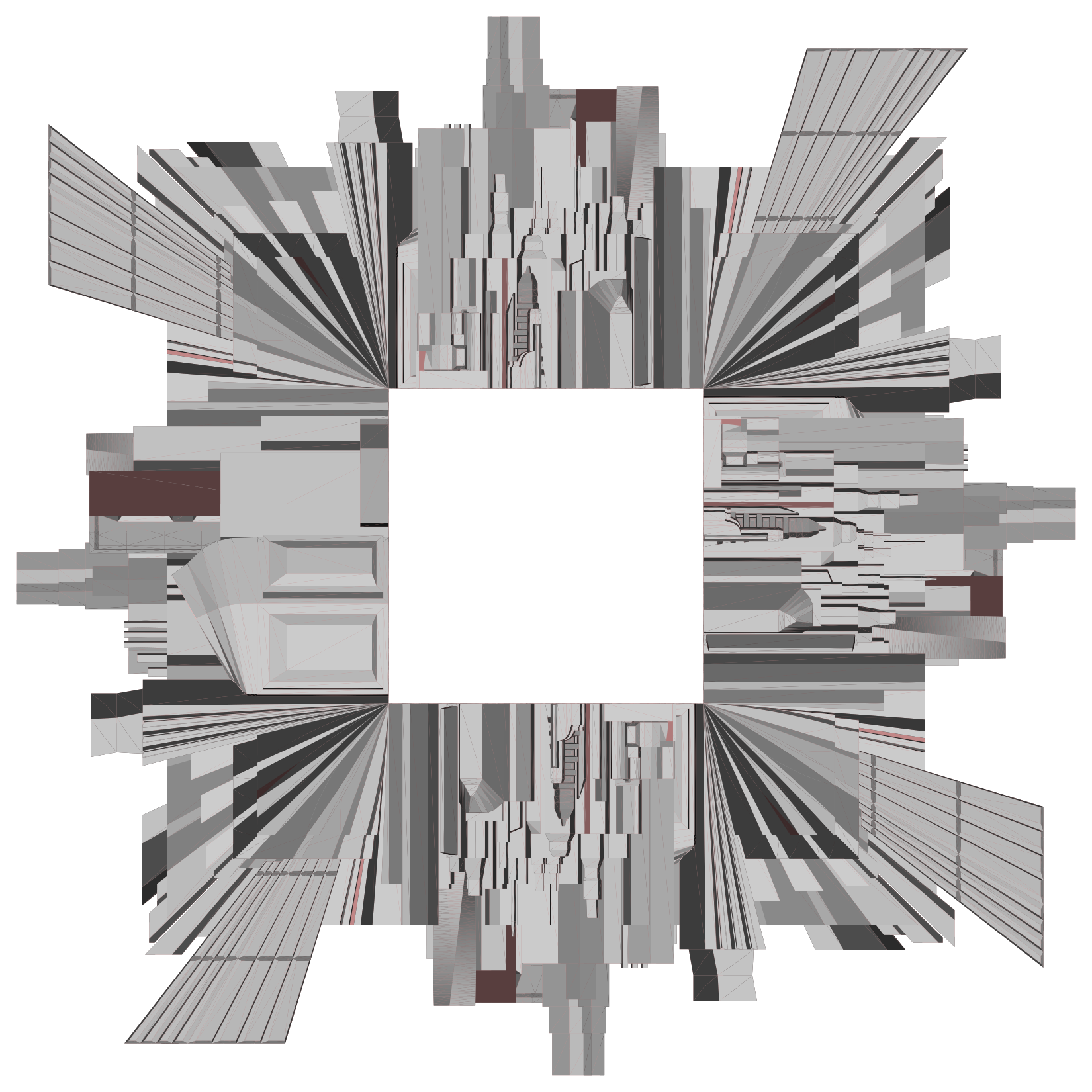 This features a large, square-shaped frame with long city buildings as decorations. These buildings are gray in color and create an interesting visual effect within the frame. In the center of the frame, there is a white space that stands out against the surrounding gray structures. This unique combination of colors and shapes creates a striking contrast between the white area and the gray buildings, making it an intriguing piece of art or design.