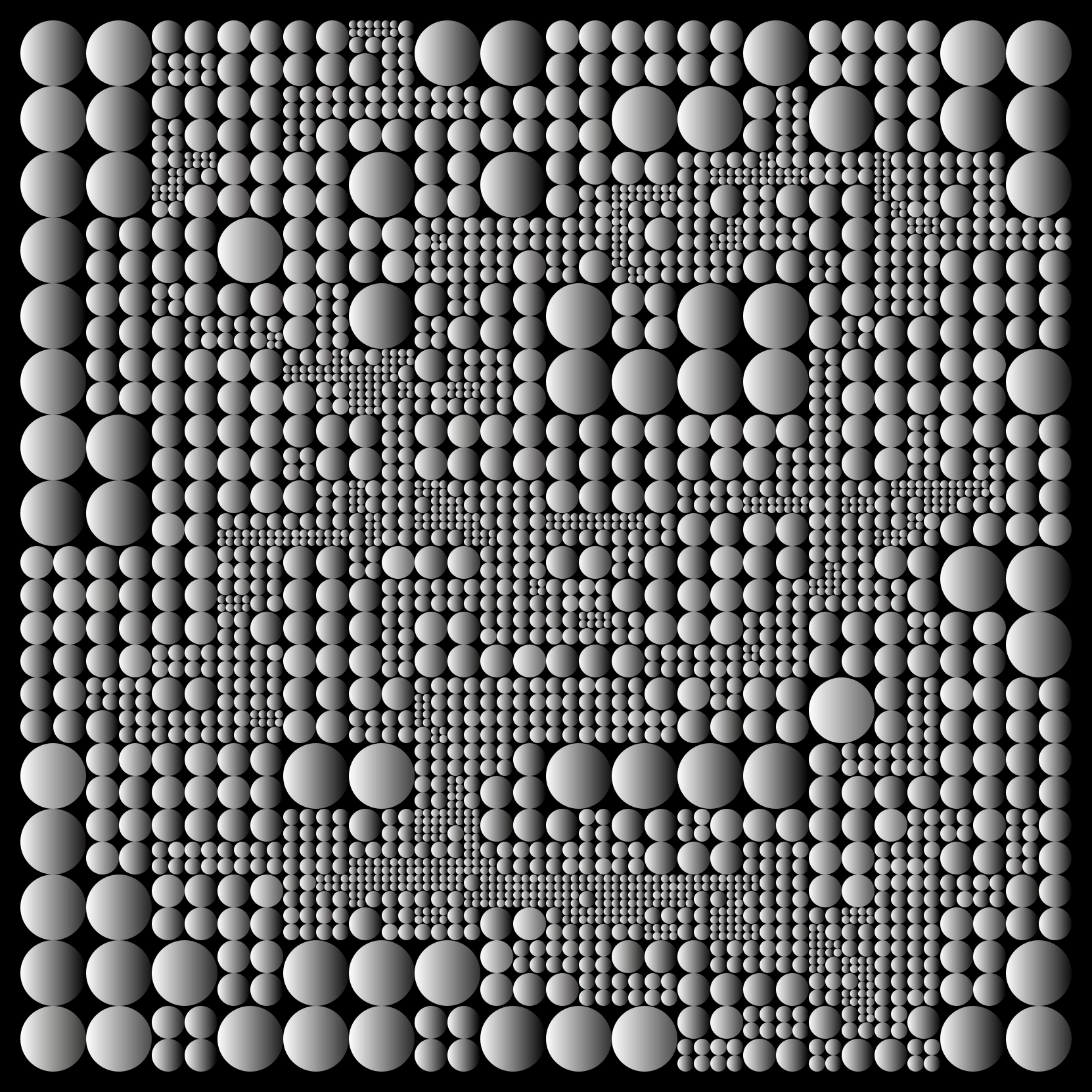 This is a black and white photo of a pattern made up of many circles. These circles are arranged in various sizes, shapes, and orientations throughout the entire frame. Some circles are larger and more prominent, while others are smaller and less noticeable. The overall effect creates an intricate and visually engaging design that captures the viewer's attention. This pattern could be used for a variety of purposes such as wallpaper, fabric, or even as part of a decorative piece in a room.