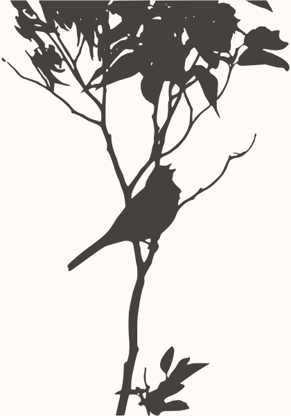 This features a black and white silhouette of a bird perched on the branch of a tree. The bird appears to be looking upwards, possibly observing its surroundings or listening for any potential threats. The tree itself is depicted in a monochromatic style, emphasizing the contrast between the bird's shape and the branches it rests upon. This artistic representation captures the essence of nature and the beauty found within the simple act of a bird perched on a branch.