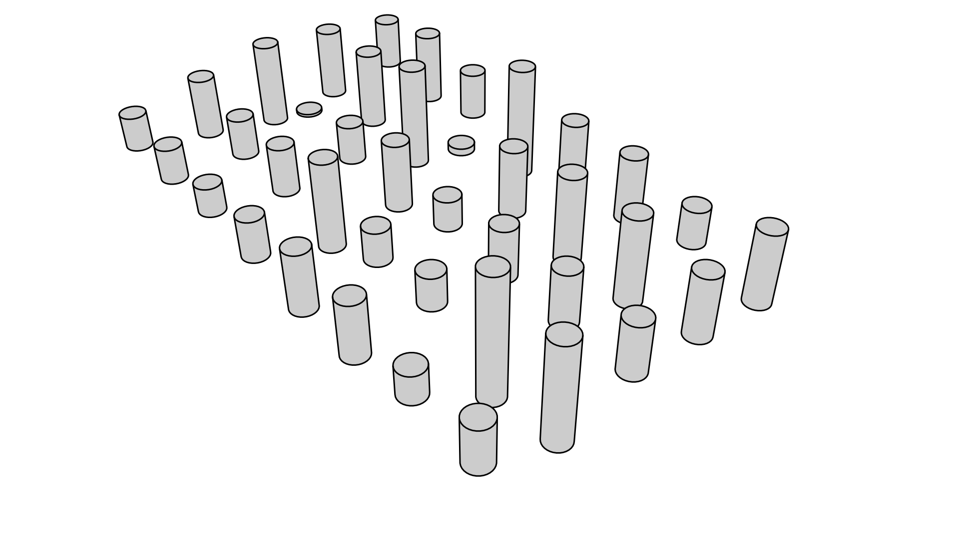 This features a white background with numerous gray cylinders arranged in various rows. There are forty cylinders in total, each having a black outline. These cylinders are placed in an organized manner, creating a visually appealing pattern on the white surface. The arrangement of these cylinders gives off a sense of depth and dimension, making it an interesting visual composition.