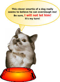 This features a cat sitting in a bowl, which is placed on the floor. The cat appears to be looking upwards with an expression of astonishment or surprise. Above the cat's head, there is a speech bubble containing text that reads "This clever smartie of a dog really seems to believe he can overwhelm me! Be sure I will not let him!" The text also includes a caption stating "I will not let him! It's my turn!"