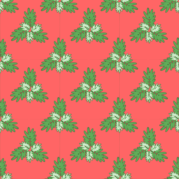 This is a seamless pattern which is derived from a leaf of the Persian silk tree or pink silk tree, also known as "nemuno-ki" in Japanese. This pattern features a red background with green leaves and branches that are scattered throughout the design. The leaves have a white outline, giving them a distinctive appearance against the vibrant red backdrop. The overall effect is an eye-catching and unique pattern that can be used for various purposes such as wallpaper, fabric, or even as a decorative element in interior spaces.