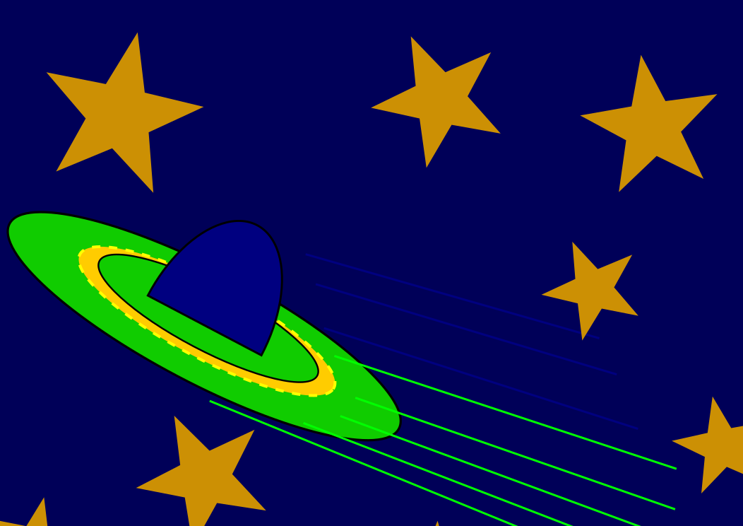 This features a green and yellow UFO flying through the night sky. It appears to be traveling at high speed, as it is leaving behind a trail of stars in its wake. The UFO's path is filled with numerous bright stars, creating an impressive display against the dark backdrop of space. This captivating scene showcases the alien spacecraft soaring through the cosmos, evoking feelings of wonder and curiosity about the mysteries of the universe.