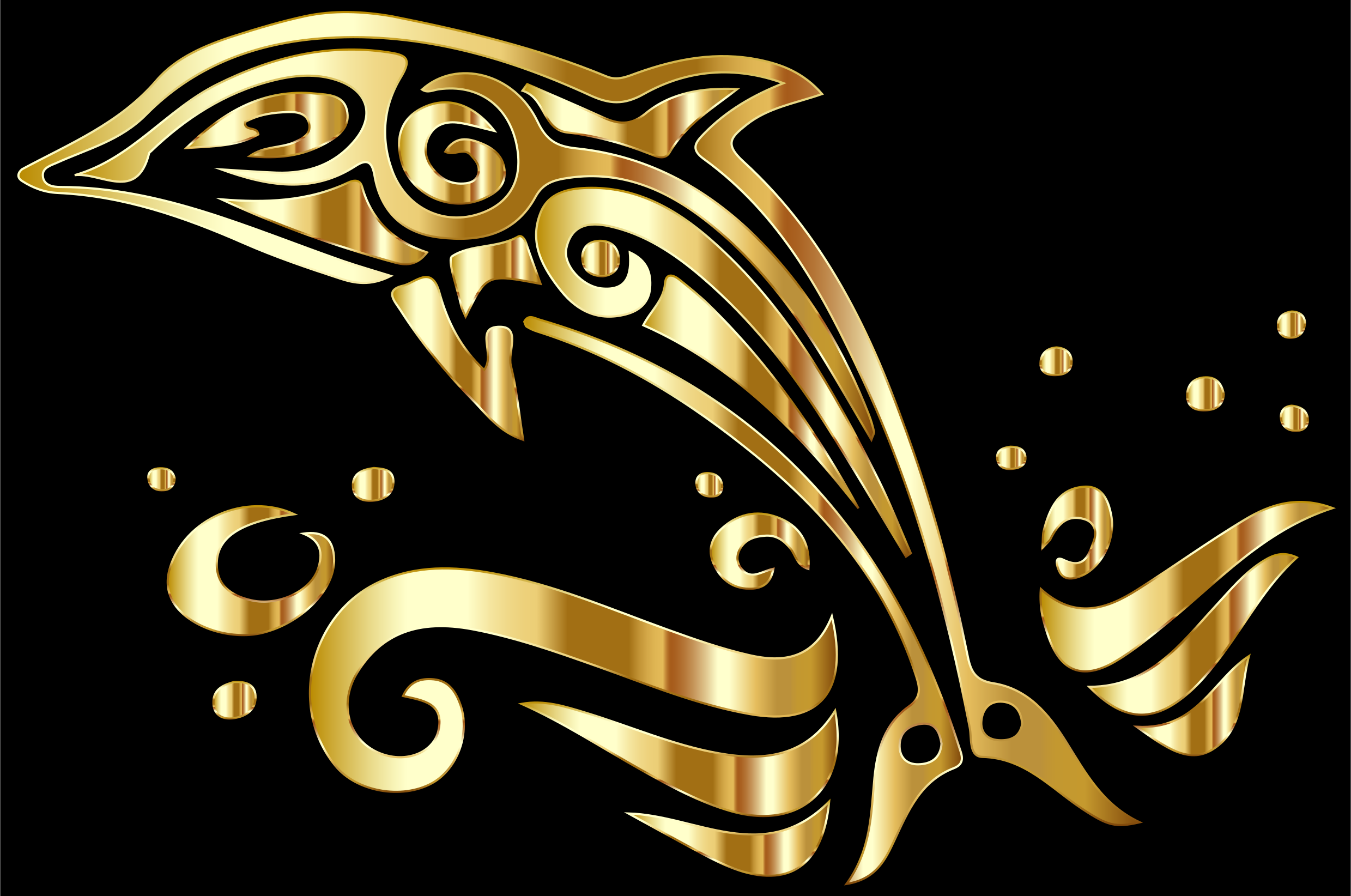 This features a beautifully crafted gold dolphin design. The dolphin is adorned with intricate patterns and swirls, giving it an elegant appearance. The design appears to be inspired by tribal artwork, as the dolphin's shape and decoration evoke a sense of cultural heritage. The gold color of the dolphin adds a touch of luxury and sophistication to the overall design. This unique piece could serve as an eye-catching decorative item or a conversation starter in any setting where it is displayed.