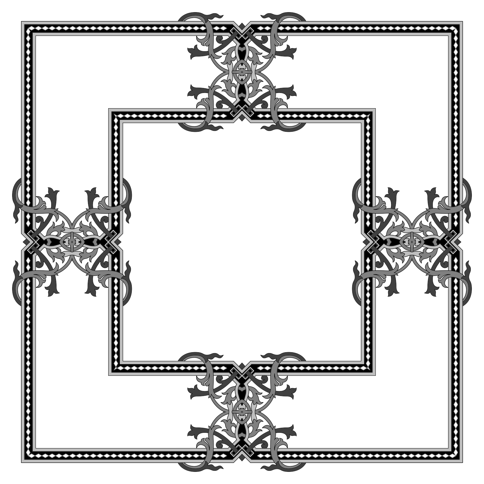 This features a decorative design with an ornate border. This intricate pattern is composed of various shapes and designs, creating a visually appealing frame. The artwork appears to be inspired by the style of a floral motif, as it incorporates elements reminiscent of flowers within its structure. The overall effect is a harmonious blend of geometric patterns and natural elements that make for an attractive piece of art or decoration.