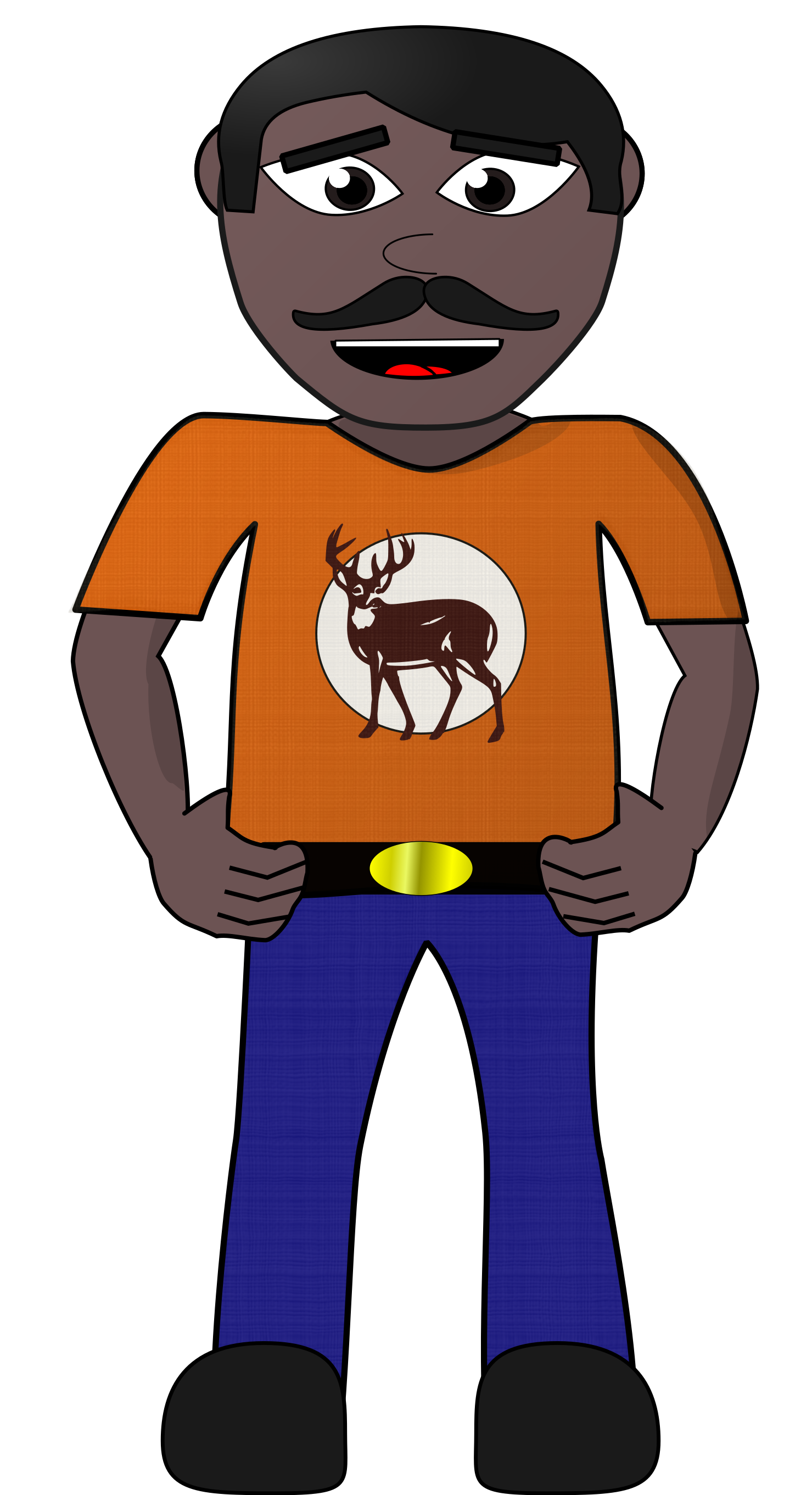 This features a cartoon man wearing an orange shirt with a deer on it. He is standing in front of a wall, posing for the camera. The man appears to be quite confident and proudly displaying his unique attire. His outfit includes blue jeans and a belt buckle, adding to the overall style of his appearance.