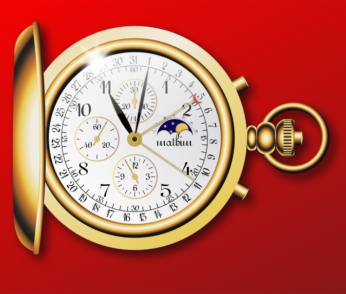 This features a gold pocket watch with a red background. The watch is prominently displayed, taking up most of the frame. It has a shiny appearance and appears to be well-maintained. The time on the watch reads 10:25, indicating that it's almost noon. The clock face features Roman numerals for numbers, adding an elegant touch to its design. Overall, the image showcases a beautifully crafted gold pocket watch with a striking red background.
