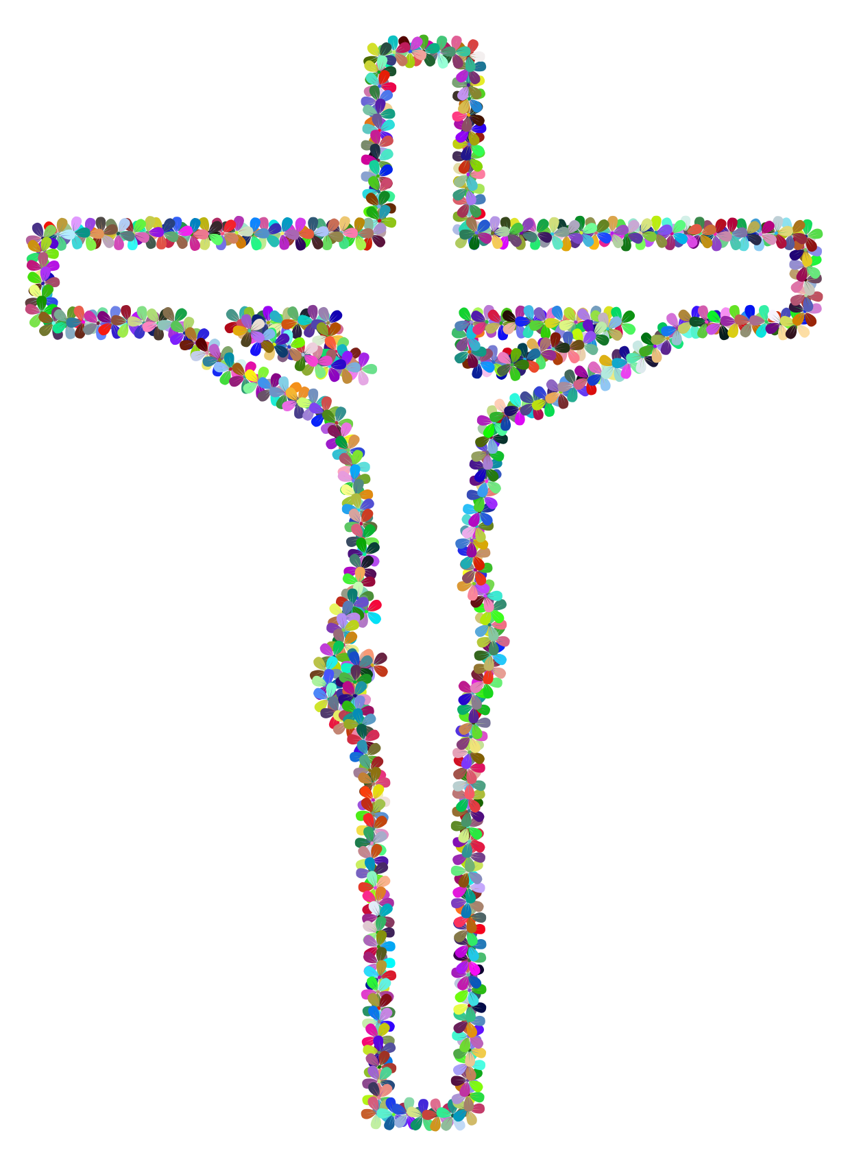 This features a large, colorful cross made up of many small hearts. These hearts are arranged in various shapes and sizes to create the illusion of a three-dimensional cross. The hearts are scattered all over the cross, with some located near the top, middle, and bottom sections. This unique design gives the impression that the cross is made from individual pieces of love or affection, creating an eye-catching and heartwarming display.