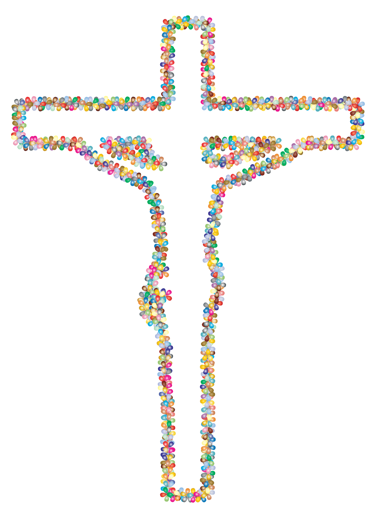 This features a large, colorful cross made up of many small hearts. These hearts are arranged in various shapes and sizes to create the illusion of a three-dimensional cross. The hearts are scattered all over the cross, with some located near the top, middle, and bottom sections. This unique design gives the impression that the cross is composed of individual pieces, making it an interesting and creative representation of the religious symbol.