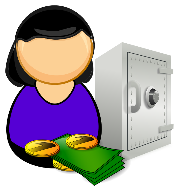 This features a cartoon illustration of a woman standing next to a silver safe. She is holding several dollar bills and coins in her hand, giving the impression that she works at a bank or has just made a significant amount of money. The scene appears to be set against a white background, which further emphasizes the contrast between the woman and the safe.