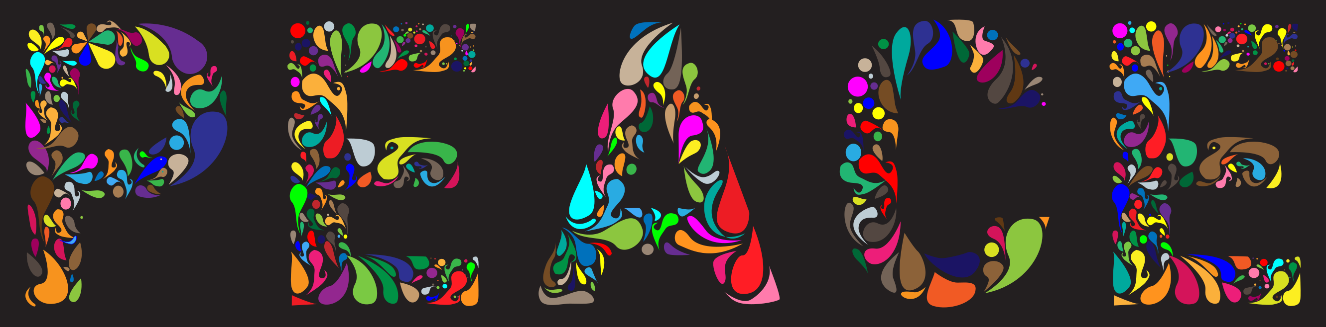 This features a large, colorful word "Peace" made up of various colored letters. These letters are arranged in such a way that they create an eye-catching and vibrant display. The colors used for the letters include red, green, blue, yellow, orange, purple, pink, brown, and black. This artistic arrangement of the word "Peace" creates a visually appealing composition that draws attention to the concept of peace.