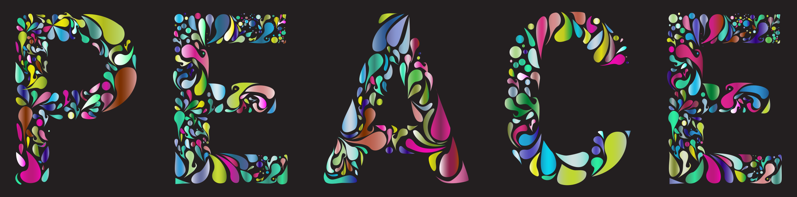 This features a large, colorful word "peace" made up of various colored shapes and images. These shapes are arranged in such a way that they form the letters of the word "peace." The colors used for each letter vary, adding to the visual appeal of the composition. This artistic arrangement creates an eye-catching display that conveys a sense of harmony and unity through its vibrant design.