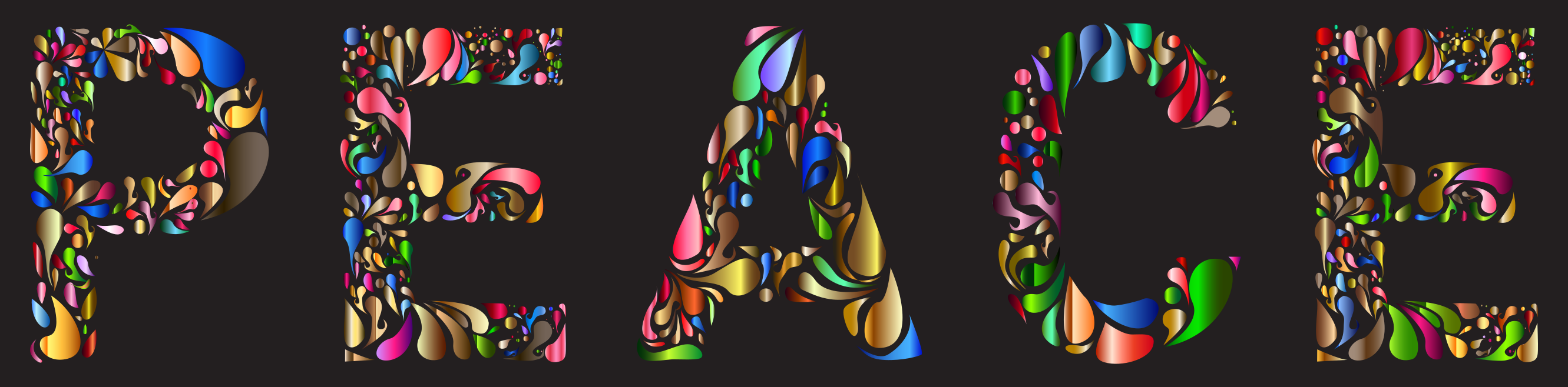 This features a large, colorful word "peace" made up of various colored shapes and images. These shapes are arranged in such a way that they form the letters of the word "peace." The colors used for each letter vary, adding to the visual appeal of the composition. This artistic arrangement creates an eye-catching display that conveys a sense of harmony and unity through its vibrant design.