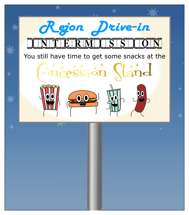 This features a sign that reads "Region Drive-In Intermission." It is placed on top of a pole, and the sign has cartoon characters drawn on it. There are three different food items displayed on the sign: two hot dogs and one hamburger. Additionally, there are four drinks depicted in various sizes, with some appearing to be milkshakes or other types of beverages. The overall design of the sign is visually appealing and inviting for customers at a drive-in restaurant.