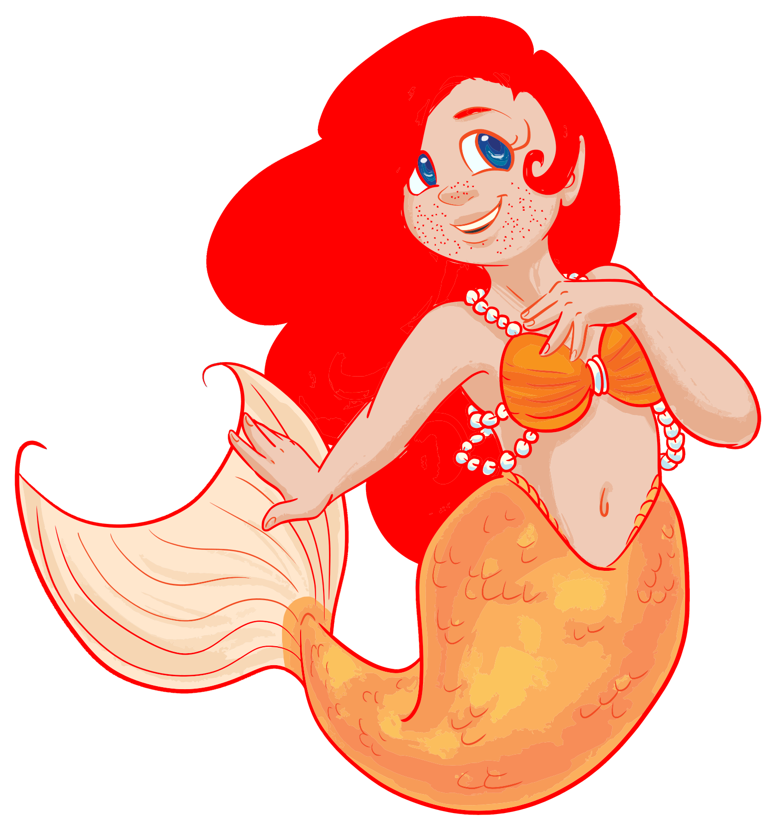 This features a colorful cartoon of a mermaid, with her hair in pigtails and wearing an orange bikini. She has a red tail and is smiling at the camera. Her eyes are blue, and she has freckles on her face. The mermaid appears to be posing for the picture, showcasing her unique appearance.