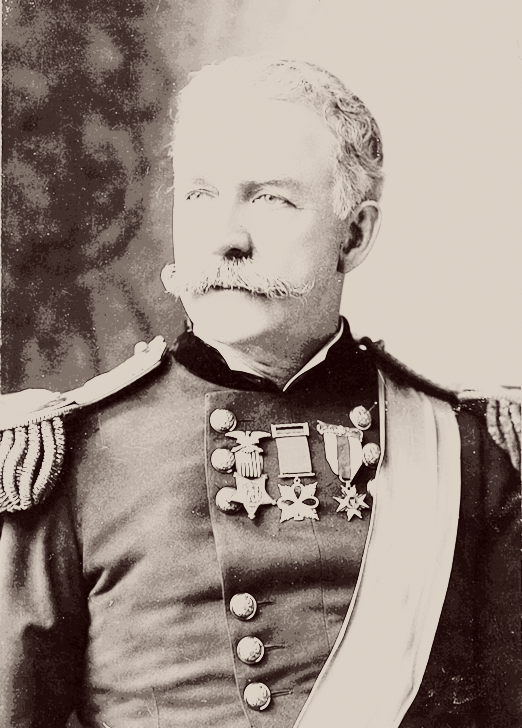 This is a black and white photograph of an older man wearing military uniform. He has a mustache, beard, and a medal on his chest. The man appears to be staring directly at the camera with a serious expression. The photo captures a moment in time, showcasing the man's distinguished appearance and military attire.