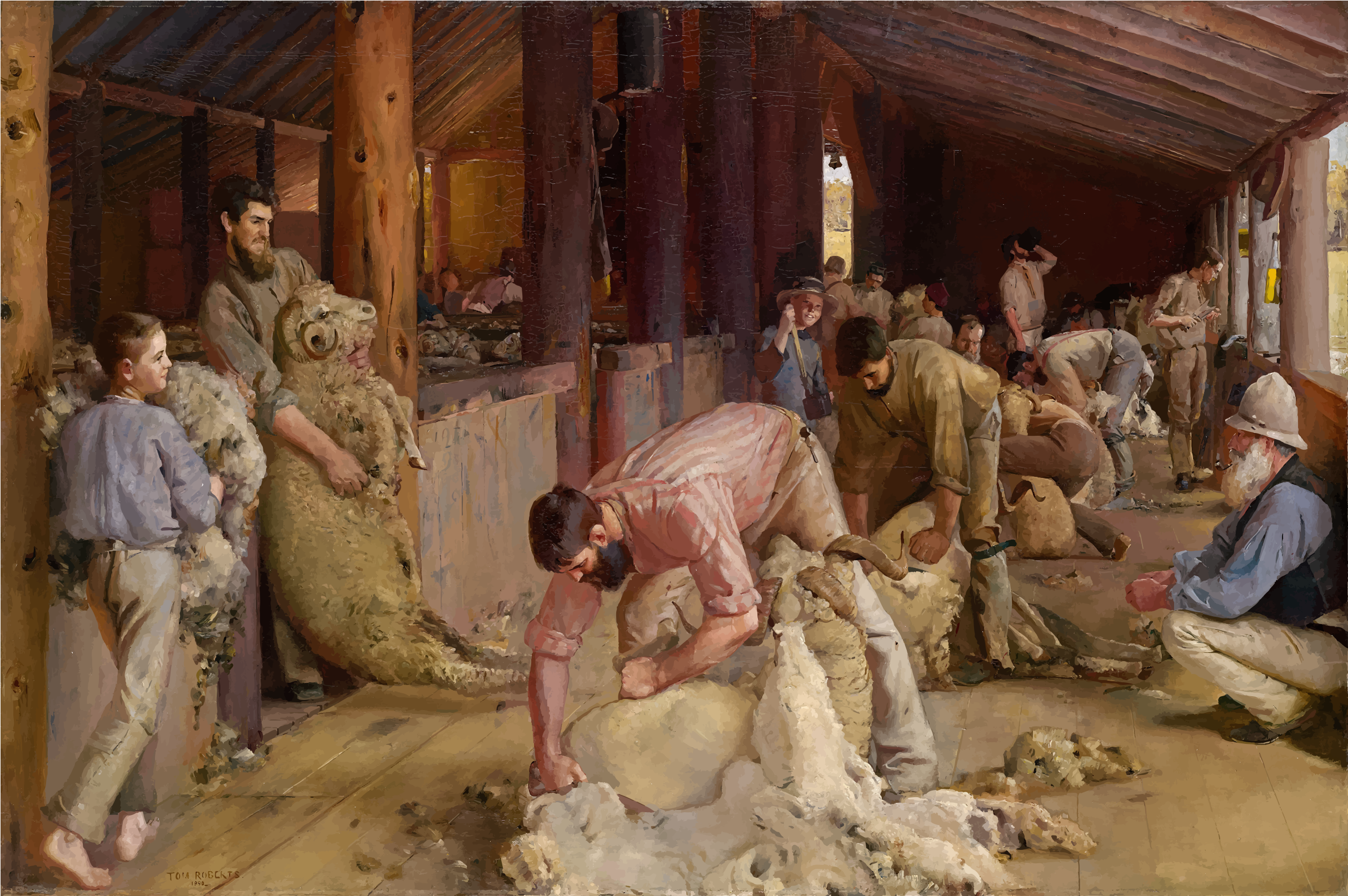 This depicts a group of men working together in a barn, shearing sheep. There are at least 13 people visible in the scene, with some standing and others sitting or kneeling down as they work on the sheep. They appear to be focused on their task, which involves shaving the wool off the animals. The barn is filled with numerous sheep, with a total of 12 sheep spread throughout the space. Some are closer to the people working on them, while others are further away or in the background. The men seem to be well-equipped for their task, as there are several pairs of scissors visible in the scene, likely used for shearing the wool. Overall, it is a lively and bustling scene showcasing teamwork and dedication to the task at hand.