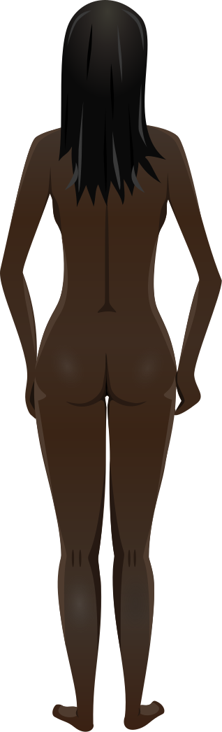 This features a woman with no shirt on, standing in front of a wall. She is posing for the camera and appears to be naked from the waist down. Her body is brown in color, giving her an earthy appearance. The woman's posture suggests that she might be looking at something or someone off-camera. The image captures her bare backside, which is a prominent feature of the scene.