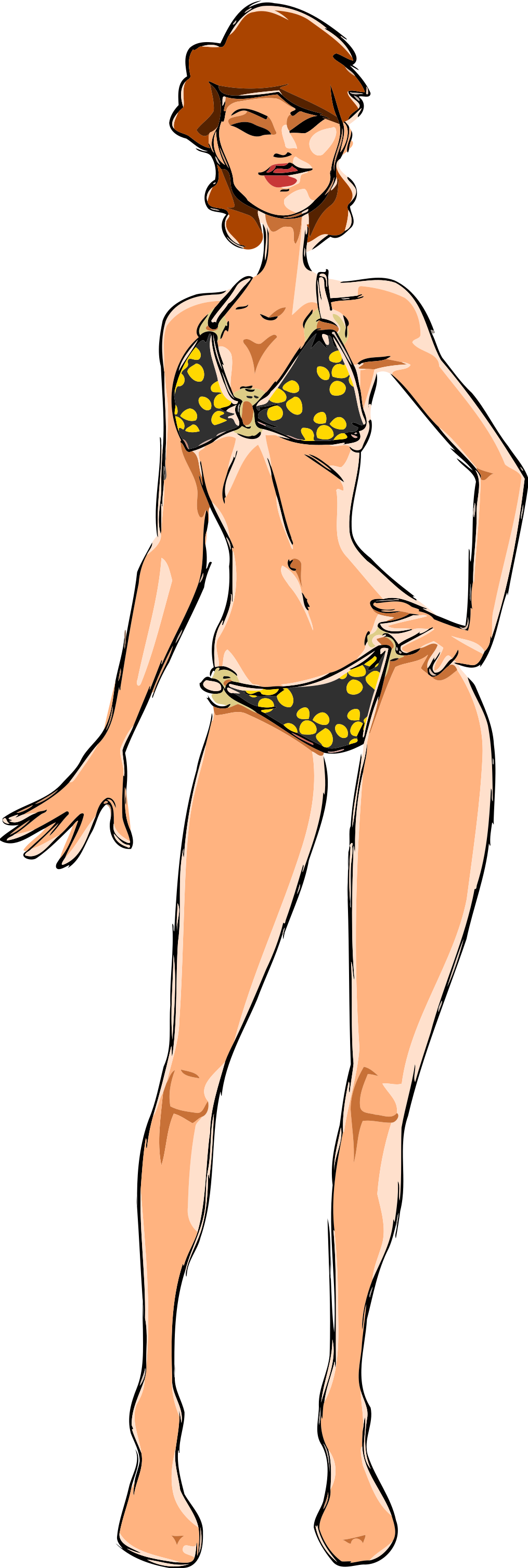This features a woman in a bikini, standing with her hands on her hips. She is wearing a yellow and black bikini top, which accentuates her curves. Her pose suggests confidence and poise as she showcases her figure. The drawing of the woman appears to be done in a cartoon style, giving it an animated feel. Overall, the image captures the essence of a confident and stylish female figure in a bikini.