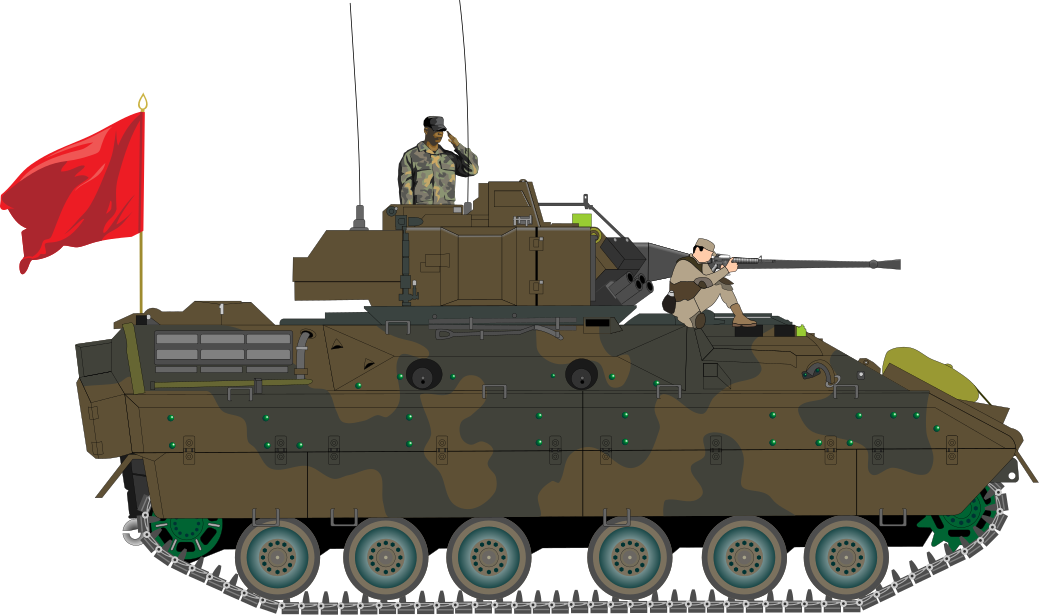 This features a camouflage army tank with a man sitting on top of it. The tank is equipped with a large gun, and the soldier appears to be observing his surroundings or preparing for action. There are two other people in the scene, one standing near the left side of the tank and another person further back on the right side. Additionally, there is a red flag flying above the tank, adding a sense of patriotism to the scene. The overall atmosphere suggests that this could be an illustration or drawing of military personnel and their equipment.
