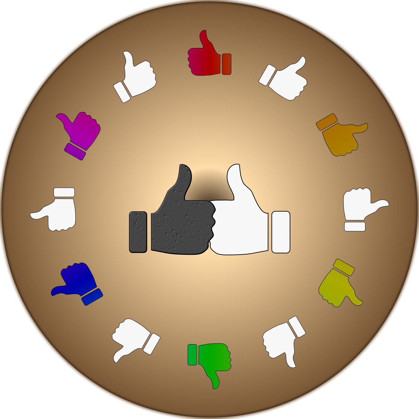 This features a round object with various symbols on it, including a large thumbs up and a large thumbs down. These symbols are arranged in such a way that they form the shape of a circle. In addition to these two main symbols, there are several smaller icons scattered around the larger ones, creating an interesting visual effect. The combination of these symbols gives the impression of a complex or intricate design, possibly representing a concept or idea related to user feedback or opinions.