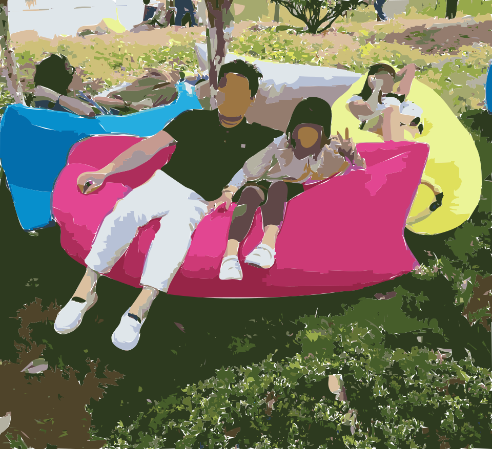 This features a man and a young girl sitting on a pink inflatable chair, possibly at an amusement park. They are surrounded by other people in the background who seem to be enjoying their time as well. There is another person sitting on a blue chair nearby, adding to the lively atmosphere of the scene. The presence of multiple chairs and people suggests that this could be a popular spot for relaxation or socializing.