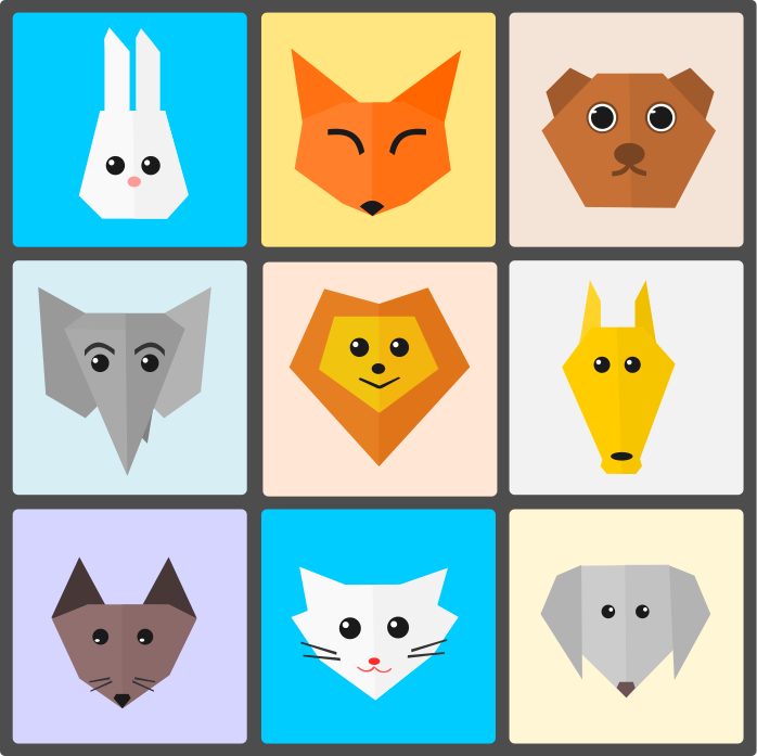 This is a square divided into nine sections, each containing the face of a different animal. These animals include a bunny, fox, bear, elephant, lion, deer, mouse, cat, and dog. Each animal is depicted in a different color, making it visually appealing and easy to identify. The arrangement of these images creates an interesting and engaging visual display that showcases the diversity of animals found in nature.