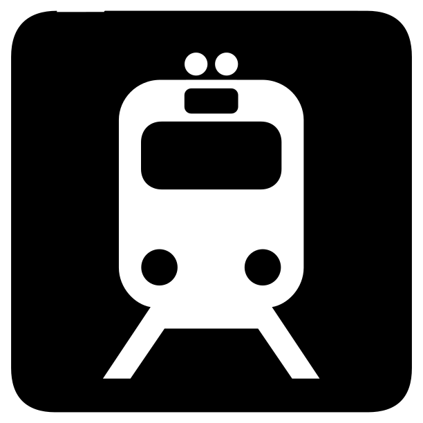 This features a black and white train icon, which is an outline of a train. This icon is likely used to represent transportation or public transit in various contexts such as maps, websites, or other visual materials. The train's design is simple yet recognizable, making it easy for people to identify the symbol when needed.