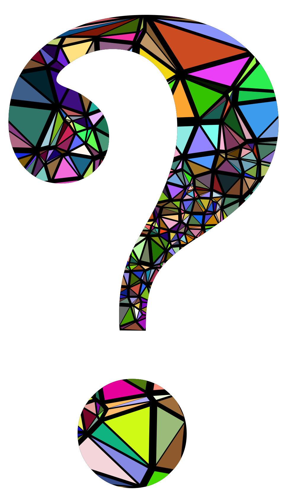 This features a large, colorful question mark made up of various geometric shapes. These shapes are arranged in such a way that they create an eye-catching and vibrant pattern. The question mark is prominently displayed on the left side of the image, with its bright colors and intricate design making it stand out against the background. This unique artwork could be used as a decorative piece or to convey a sense of curiosity and wonder in various settings.
