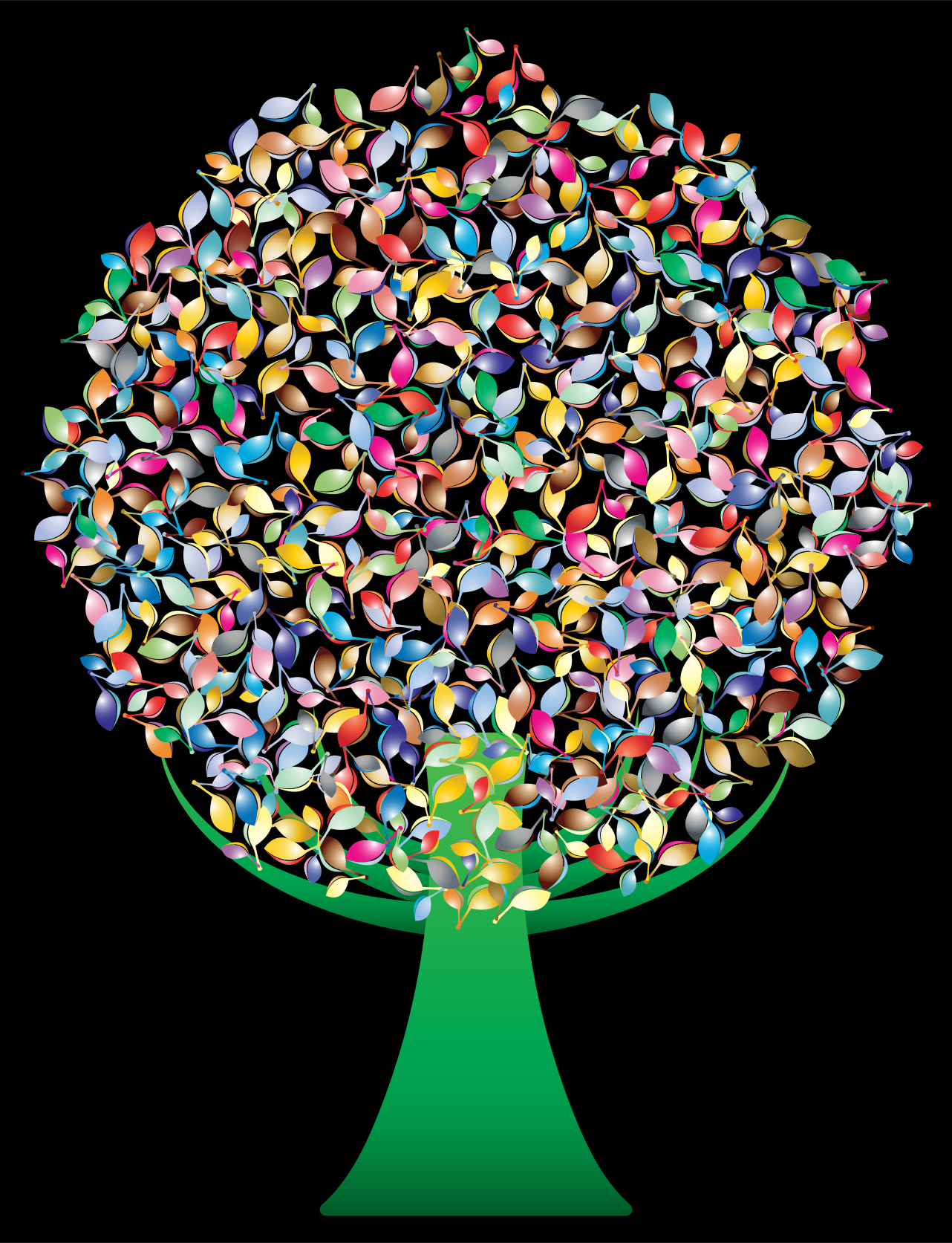 This features a large tree with many leaves, creating an artistic and colorful display. The tree is adorned with various colored leaves, including green, yellow, red, blue, pink, orange, and purple. These leaves are scattered all over the tree, giving it a vibrant and lively appearance. The tree's branches extend outwards, showcasing its fullness and beauty. This image captures the essence of nature and the beauty found in trees with their diverse colors and patterns.