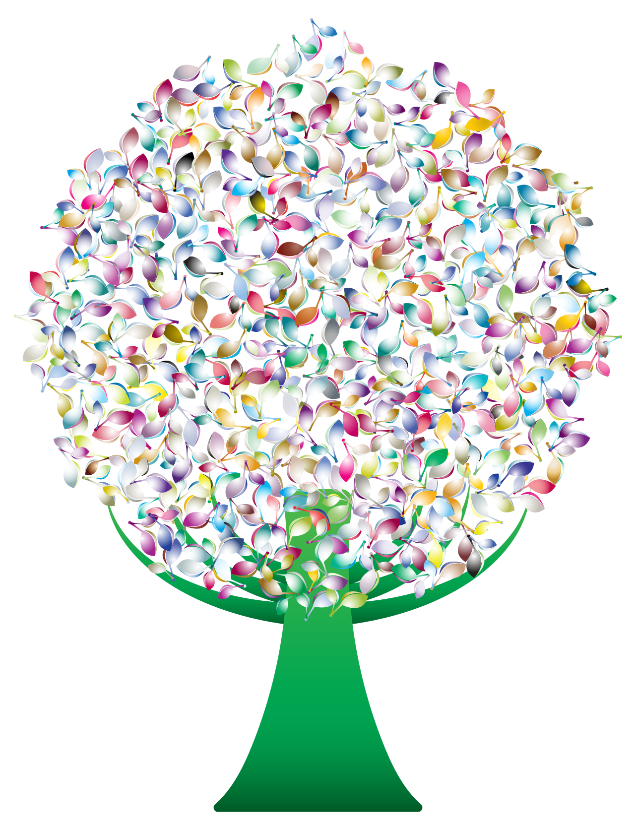 This features a large, colorful tree with a green stem. The tree is adorned with various colored leaves that create an abstract and vibrant appearance. The leaves vary in size and shape, adding to the visual interest of the scene. The tree's stem stands out as it is painted in a contrasting shade of green, making it a focal point within the image. Overall, this artistic representation of a tree showcases its beauty through the use of colorful leaves and an eye-catching stem.