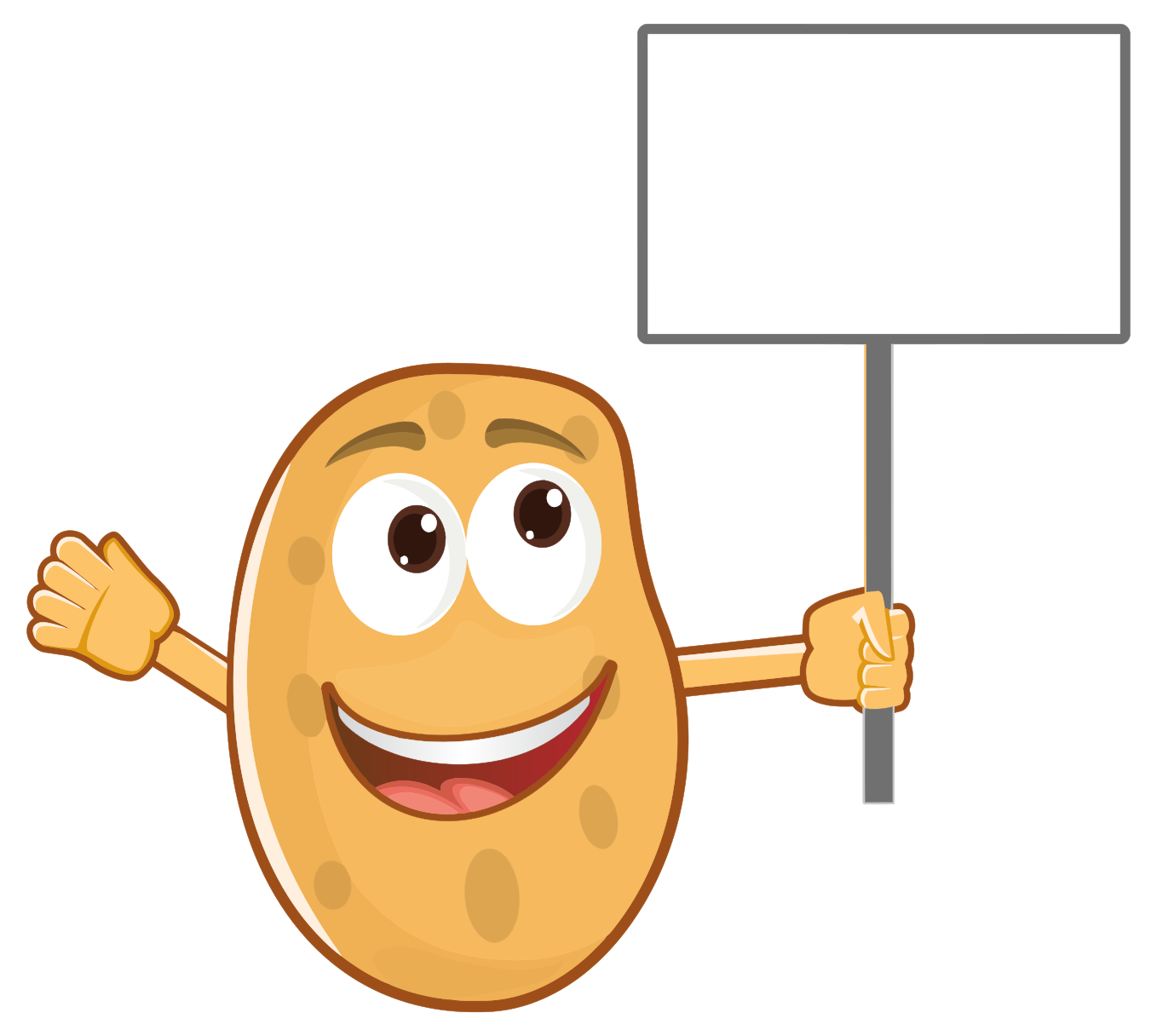 This features a cartoon potato with a smile on its face, holding up a sign. This whimsical character is the main focus of the scene and appears to be promoting something or simply enjoying itself. The potato's arms are spread out, giving it an inviting and friendly demeanor. The sign that the potato is holding is blank, allowing for various interpretations and messages to be displayed depending on the context in which this image is used. Overall, the cartoon potato with a sign creates a lighthearted and entertaining visual.