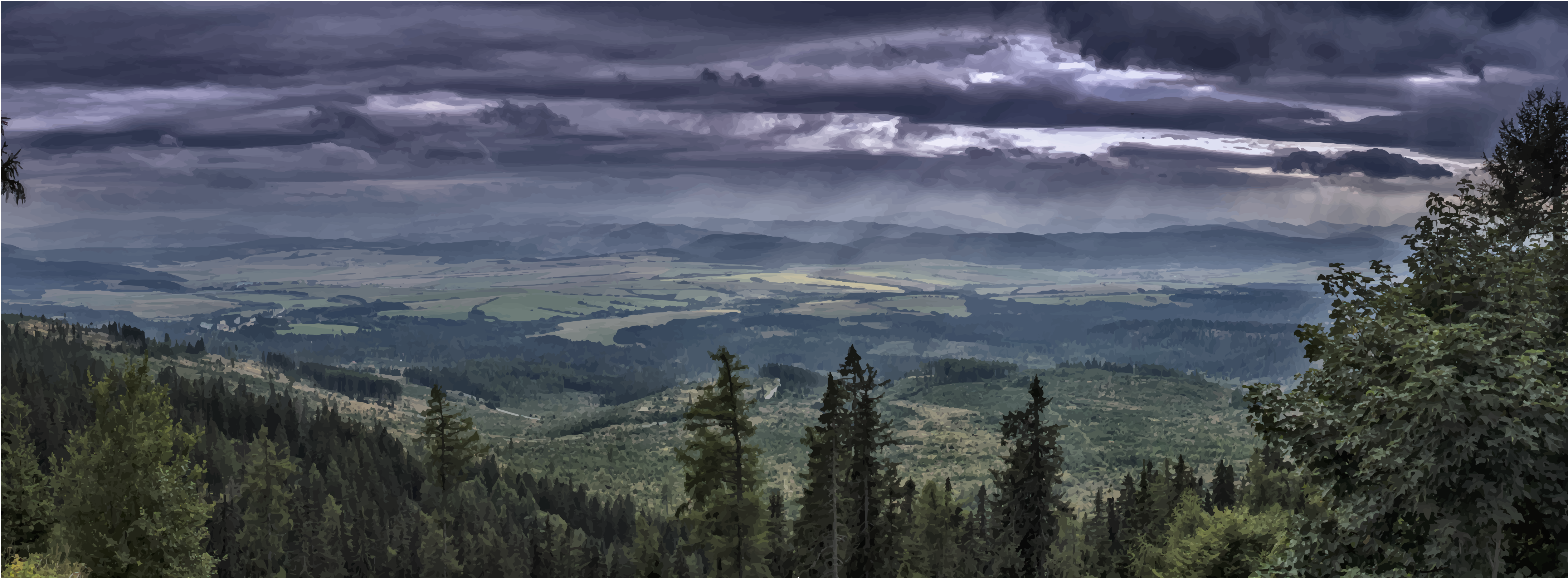 This depicts a beautiful mountain landscape with lush green fields and trees. The sky above the scene is dark, creating an ominous atmosphere. The mountains are covered in trees, giving them a majestic appearance. There are several pine trees scattered throughout the scene, adding to the natural beauty of the area. Overall, it's a stunning view that captures the essence of nature and its grandeur.