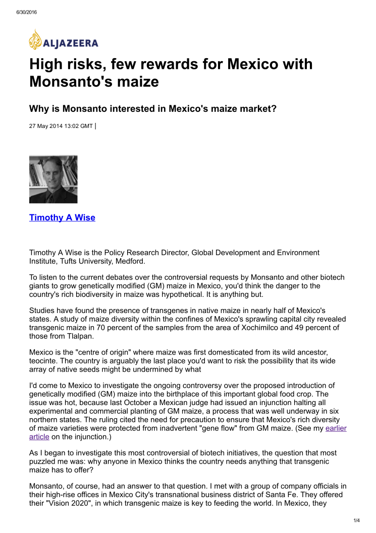 This is a screenshot of an article on the internet, likely from Yahoo News. The article discusses Mexico's maize market and its relationship with Monsanto. The headline reads "High Risks for Mexico with Monsanto Maize." The article features a man in a black and white photo as the main subject, possibly related to the topic of the article. The text is written in Spanish, indicating that it might be a Spanish-language publication or website. There are several sentences throughout the article, providing information about Mexico's maize market and its connection with Monsanto. The content appears to be informative and engaging for readers interested in this topic.
