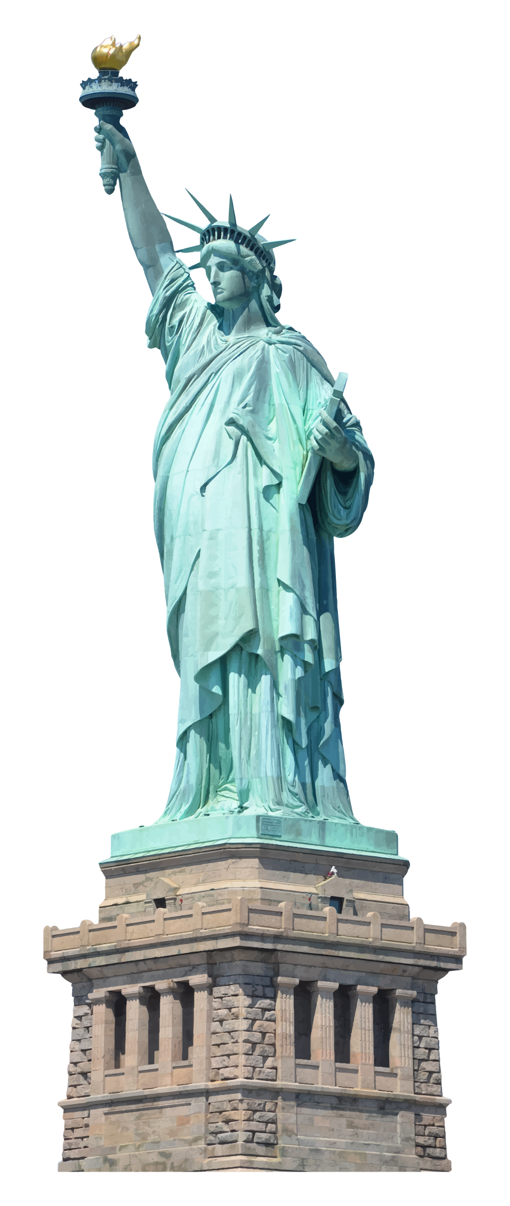 This features a close-up of the Statue of Liberty, an iconic symbol of freedom and democracy. The statue is situated on top of a pedestal, which adds to its grandeur. The statue itself is made of stone and stands tall in front of a building. The background is white, providing a stark contrast against the statue's green color. This image captures the essence of the Statue of Liberty as an enduring symbol of hope and freedom for many people around the world.