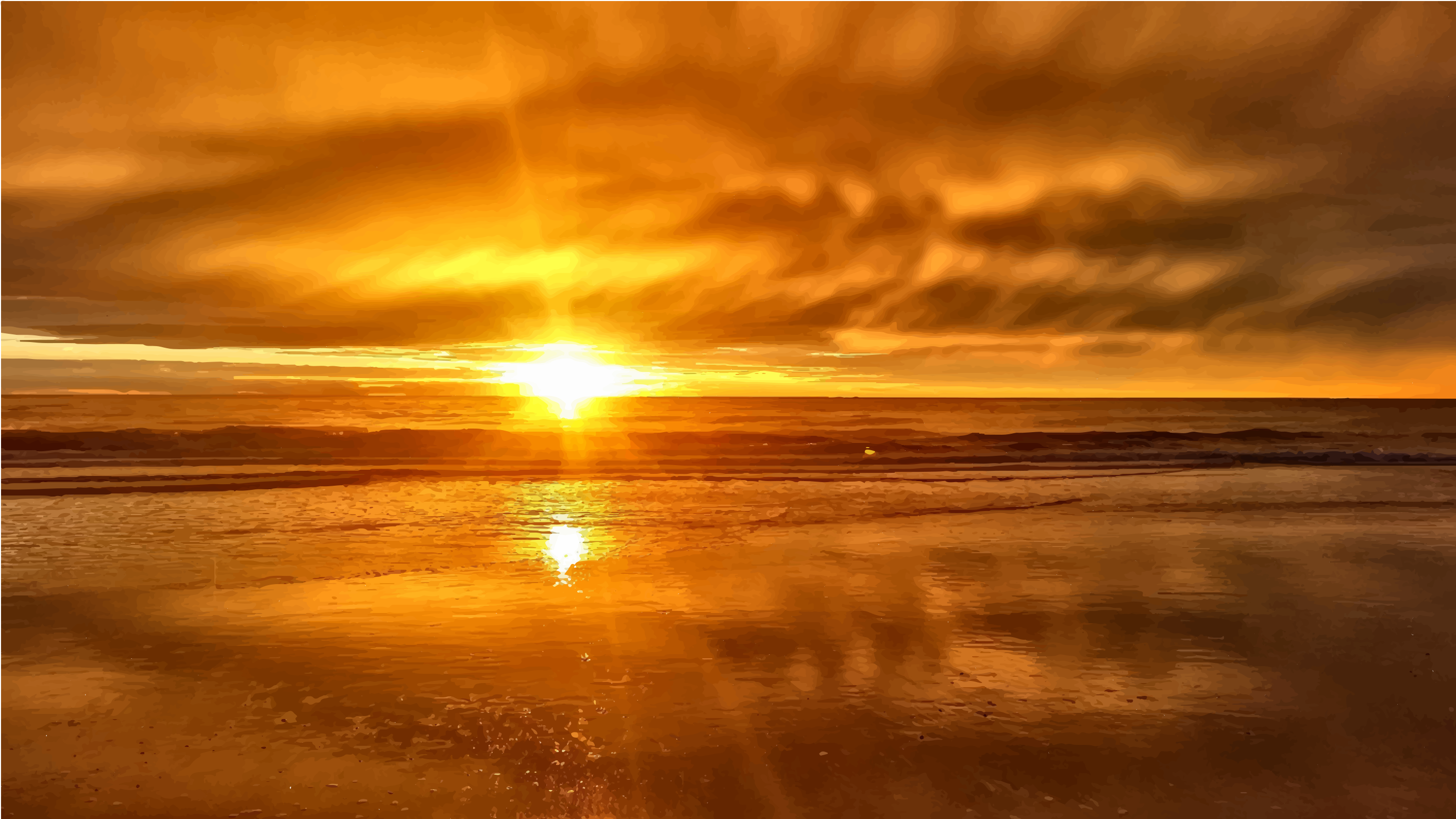 This captures a beautiful sunset over the ocean, with the sun setting behind the beach. The sky is filled with clouds, creating an atmospheric backdrop for the scene. The reflection of the sun on the water creates a stunning visual effect, as it appears to be rising from the ocean. The beach itself has sand and some rocks scattered around, adding to the natural beauty of the setting. Overall, this image evokes feelings of tranquility and serenity, making it an ideal representation of a peaceful evening by the sea.