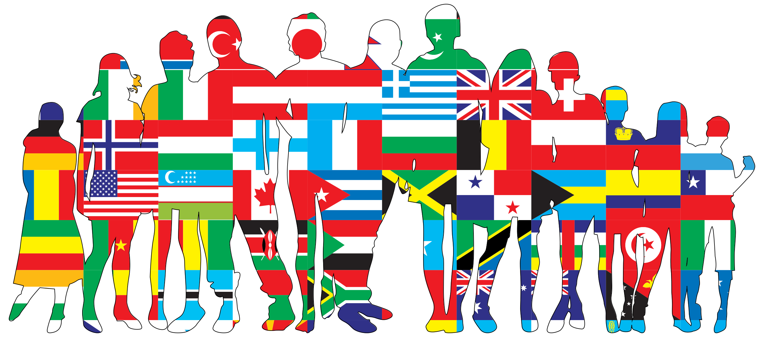 This features a large group of people standing together, each person's silhouette is made out of the flags of their respective countries. There are at least 13 different flags visible in the scene, representing various nations from around the world. The people appear to be gathered for an event or celebration, as they stand close together and display a sense of unity. The arrangement of the flags creates a visually striking composition that highlights the diversity and inclusiveness of this gathering.