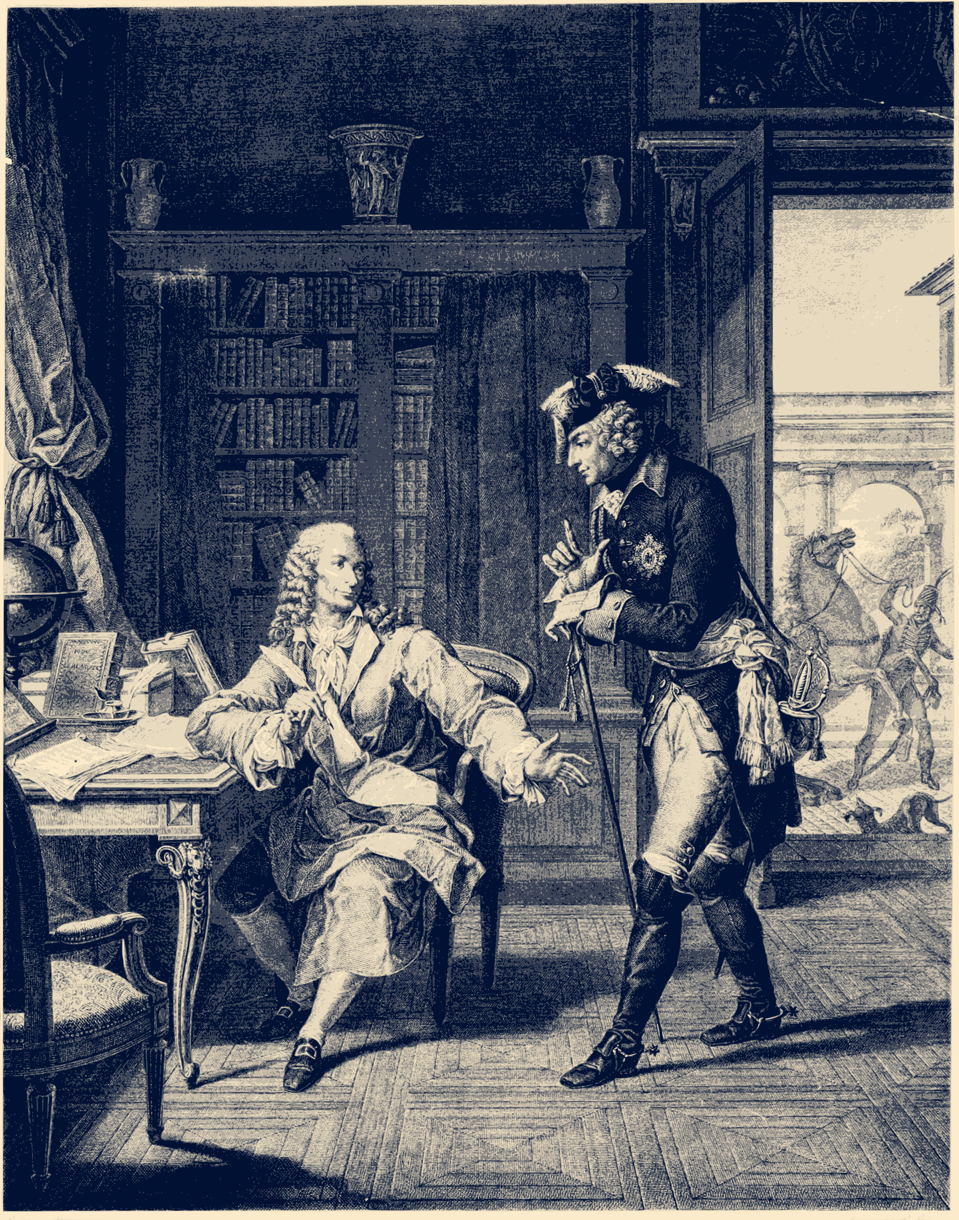This is a black and white drawing of two men in a room. One man, dressed in a suit with a wig, appears to be talking to the other man who is sitting down. They are both engaged in conversation while surrounded by various books scattered throughout the scene. There are at least 13 books visible in different positions around them, some on the floor and others placed on surfaces. The room also features a chair near the center of the image where the seated man might be sitting.