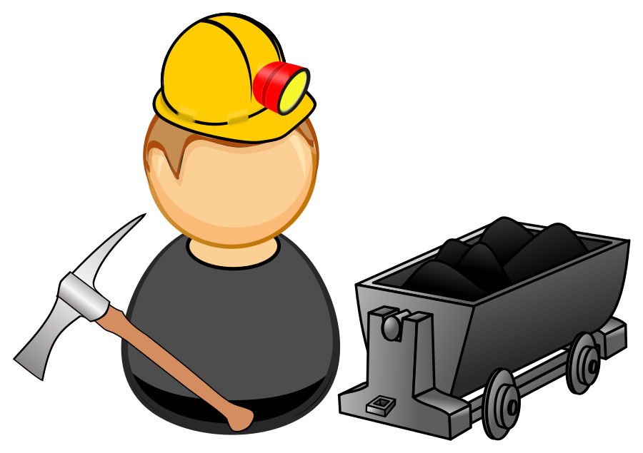 This features a cartoon man wearing a hard hat, standing next to a cart filled with coal. He is holding an oversized pickaxe in his hand, ready for work. The scene appears to be set on a construction site or a similar environment where the man might be working with heavy equipment and materials. The man's attire suggests that he is prepared for labor-intensive tasks, while the cart of coal indicates that he may be involved in mining or transportation of resources.
