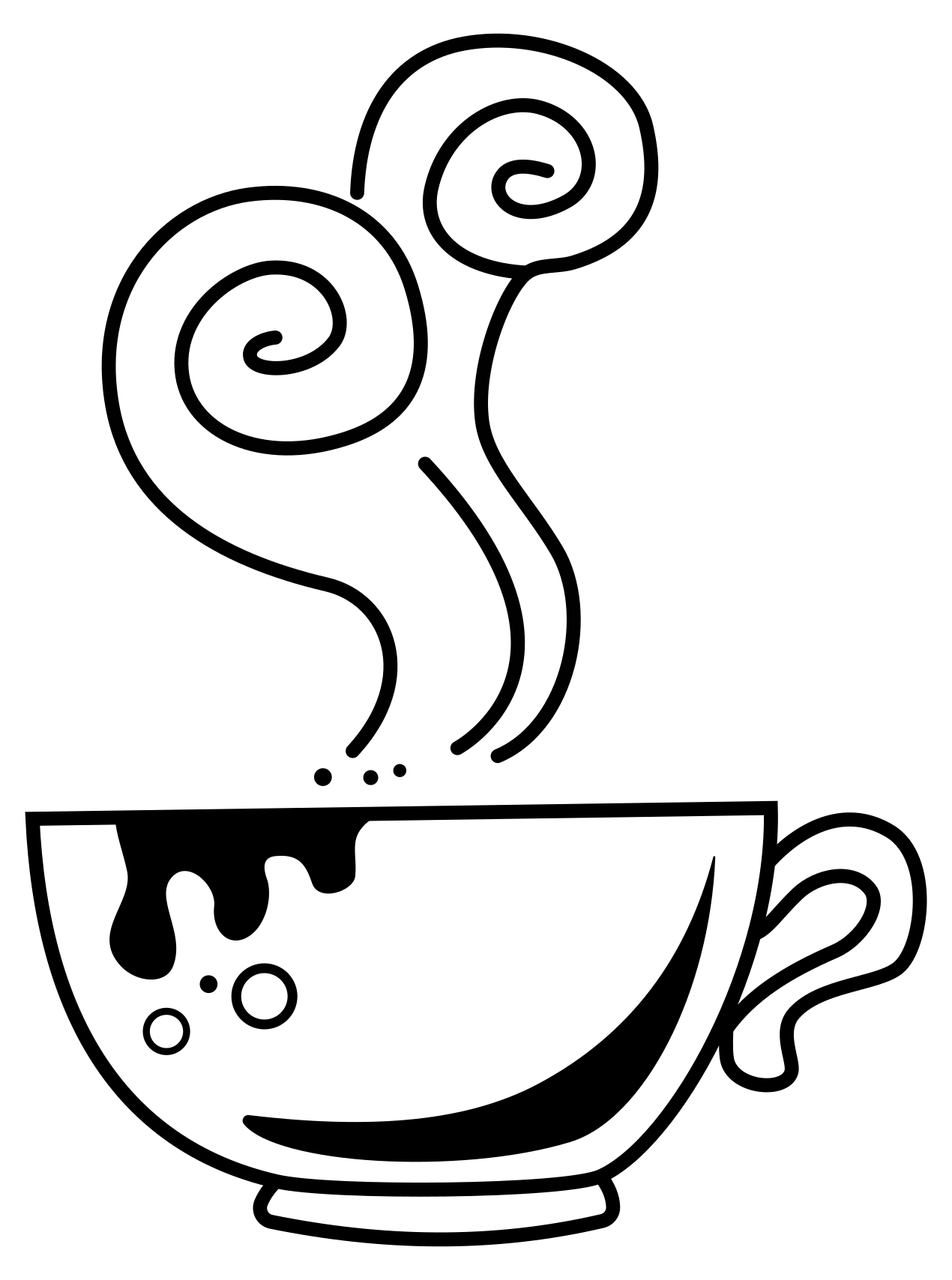 This features a black and white illustration of a hot coffee cup with steam coming from it. The cup is filled to the brim, and there are two small drops of liquid in the middle of the cup. Above the cup, there is an abstract spiral design that adds visual interest to the scene. This creative representation of a coffee mug can be used for various purposes such as advertising or decoration. The combination of the steam, droplets, and spiral design creates a unique and eye-catching image.