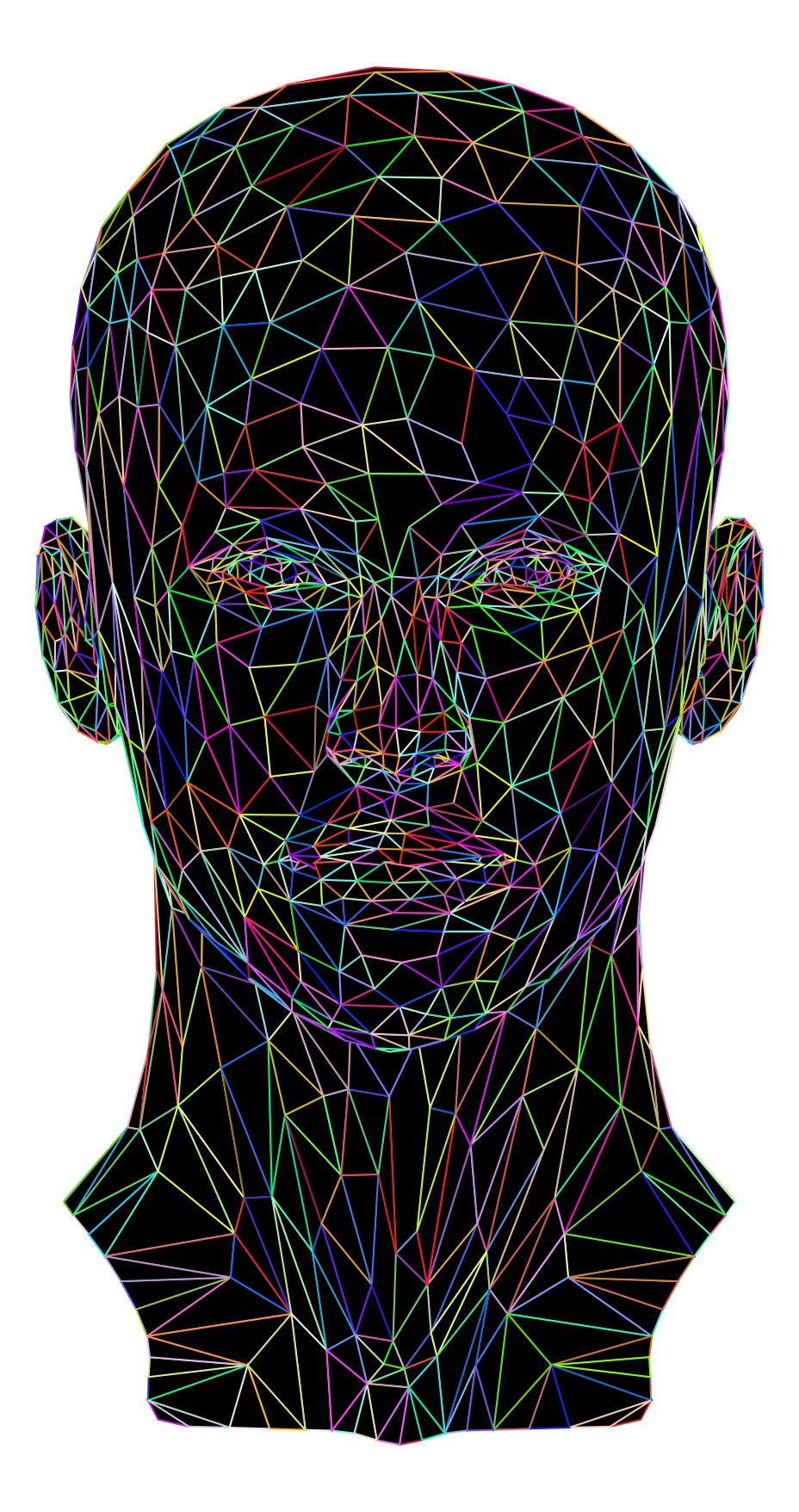 This features a close-up of a colorful, geometric head with a face and neck. The colors are vibrant and varied, creating an interesting visual effect. The design appears to be a combination of shapes and patterns that make up the human form. This unique artistic representation of a head is likely intended to evoke curiosity or admiration from viewers.
