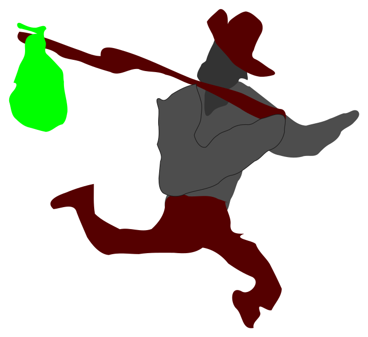 This features a man in a cowboy hat and clothing, running with a green bag or satchel. He appears to be carrying the bag on his back as he moves swiftly across the scene. The man's attire suggests that he might be a cowboy or a character from an old western movie. The image is a black and white drawing, which adds a sense of nostalgia and timelessness to the scene.