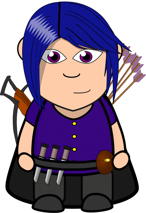 This features a cartoon character with blue hair, dressed in black clothing and holding a bow and arrow. The character appears to be a female archer, possibly from a fantasy or sci-fi setting. She is wearing a purple shirt and has a smiling expression on her face. In addition to the bow and arrow, she also holds a knife in one hand and a sword in the other. The scene gives off an adventurous vibe with the character ready for action.