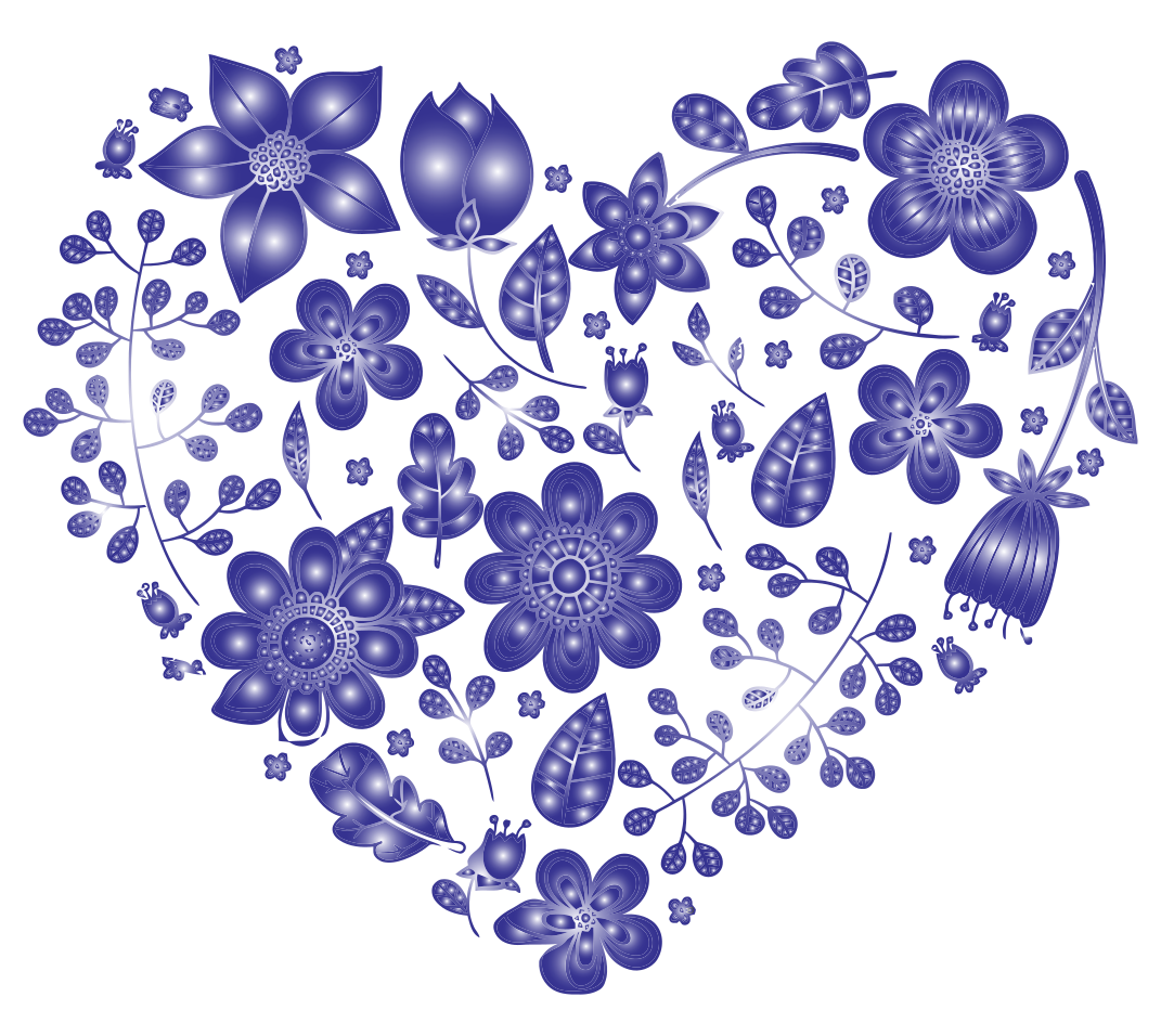 This features a heart made up of various blue flowers, including purple and white ones. These flowers are arranged in such a way that they form the shape of a heart, with some petals overlapping each other to create the distinctive outline. The heart is filled with these beautiful flowers, creating an eye-catching and visually appealing design. The blue color of the flowers adds a sense of calmness and tranquility to the overall composition, making it an attractive piece of art or decoration.