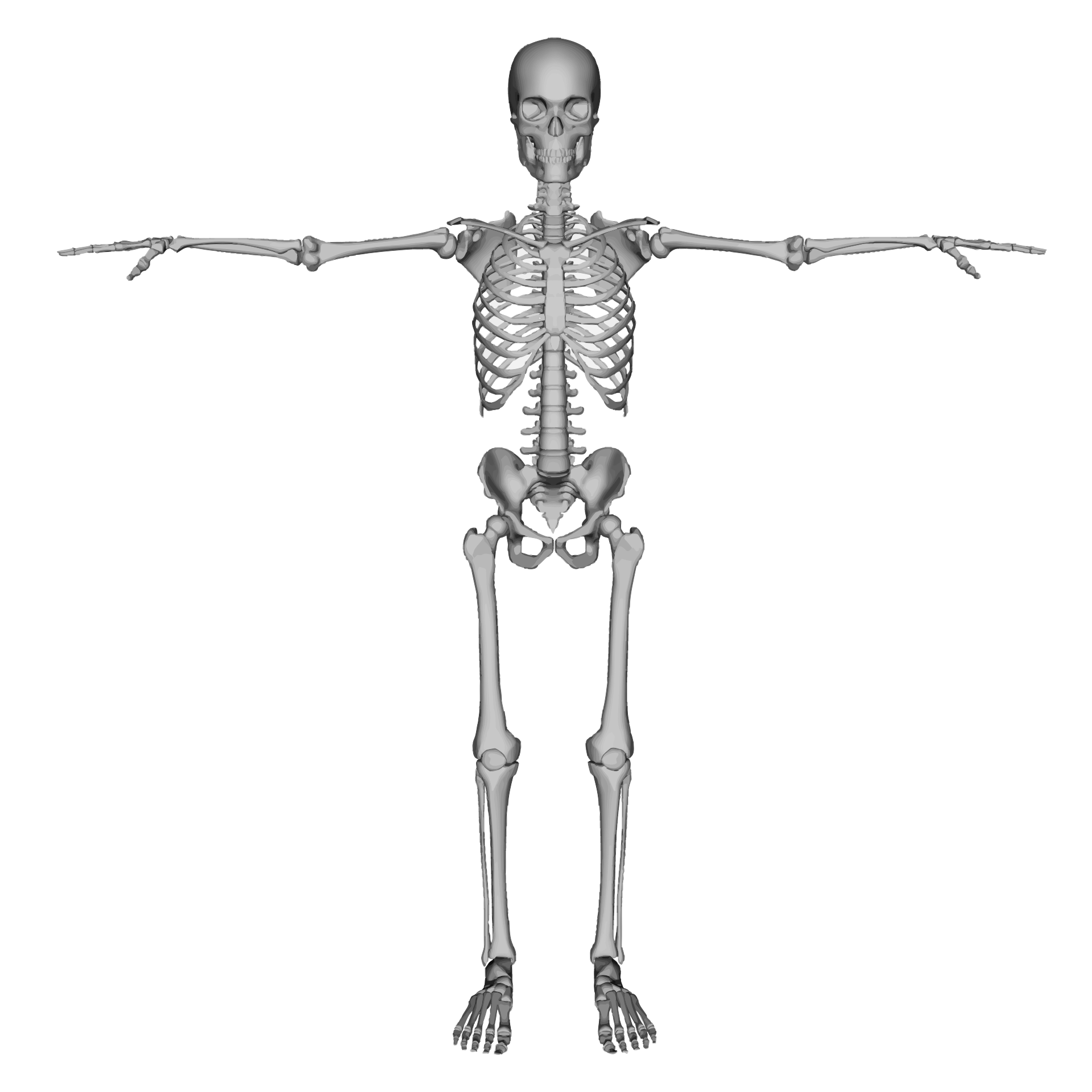 This features a three-dimensional model of a skeleton, showcasing its bones and joints in detail. It is posed in an artistic manner, with the skeletal structure standing upright and making a T shape. This representation of the human body highlights the intricate connections between the various bones and their roles in supporting our bodies. The model's design allows for a clear understanding of the skeleton's structure and its components, providing an educational and visually appealing display.