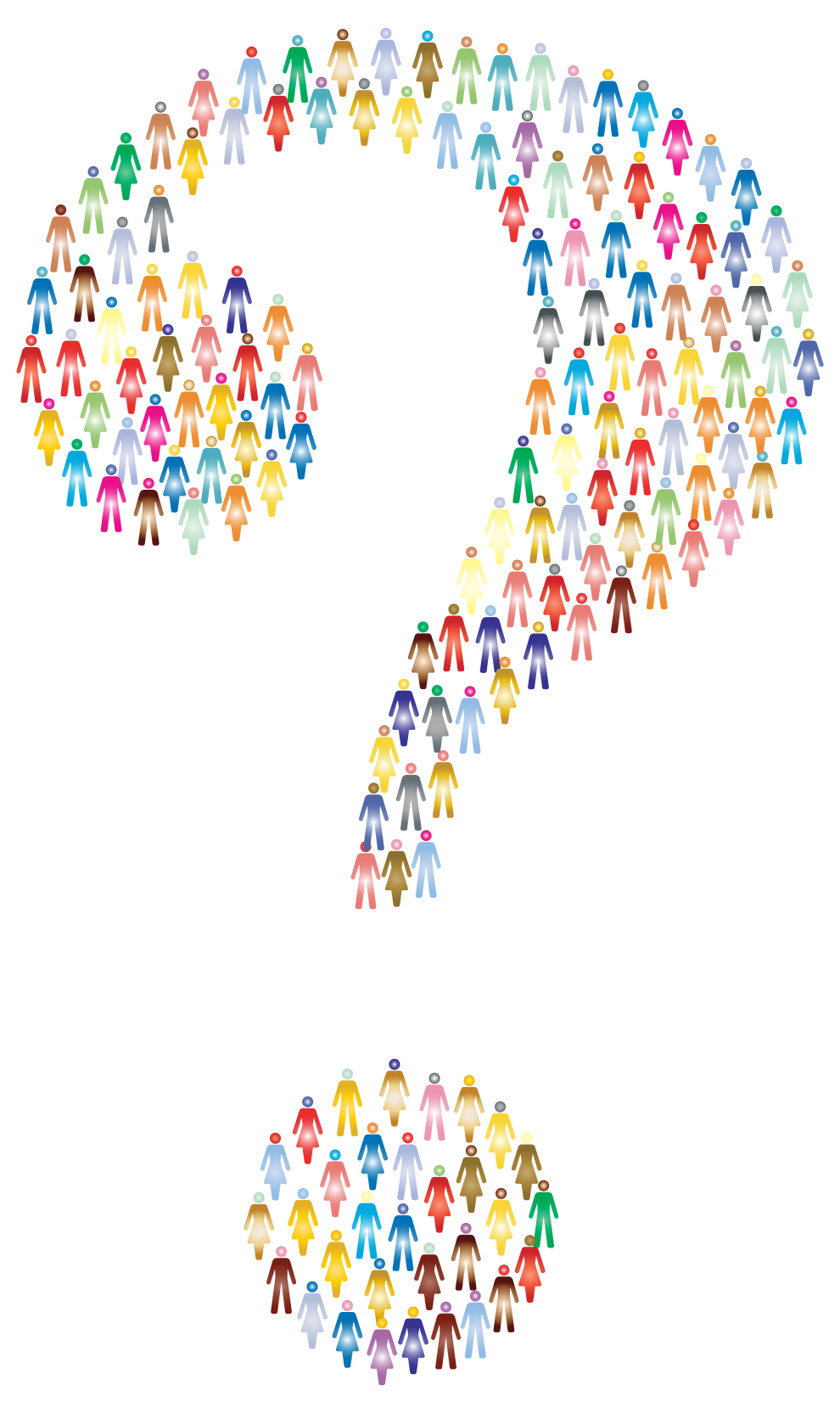 This features a large question mark made up of many people. Each person is represented by a small figure, and they are all arranged in various positions to create the shape of the question mark. The figures are colorful, adding a vibrant touch to the overall design. This unique illustration showcases creativity and artistic expression through the use of human figures as building blocks for creating an interesting visual element.