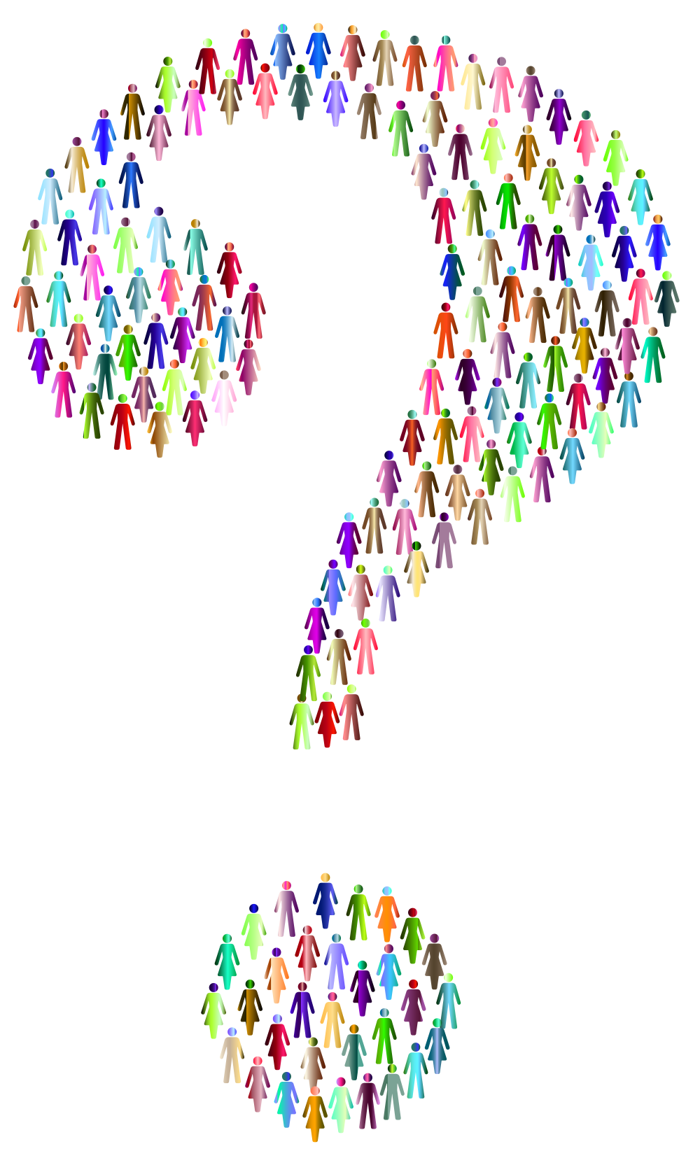 This features a large question mark made out of small human silhouettes. These silhouettes vary in color, creating an interesting and visually appealing design. The background is white, which provides a clean and uncluttered appearance to the overall composition. This unique representation of a question mark showcases creativity and artistic expression through the use of people as the primary subject matter.