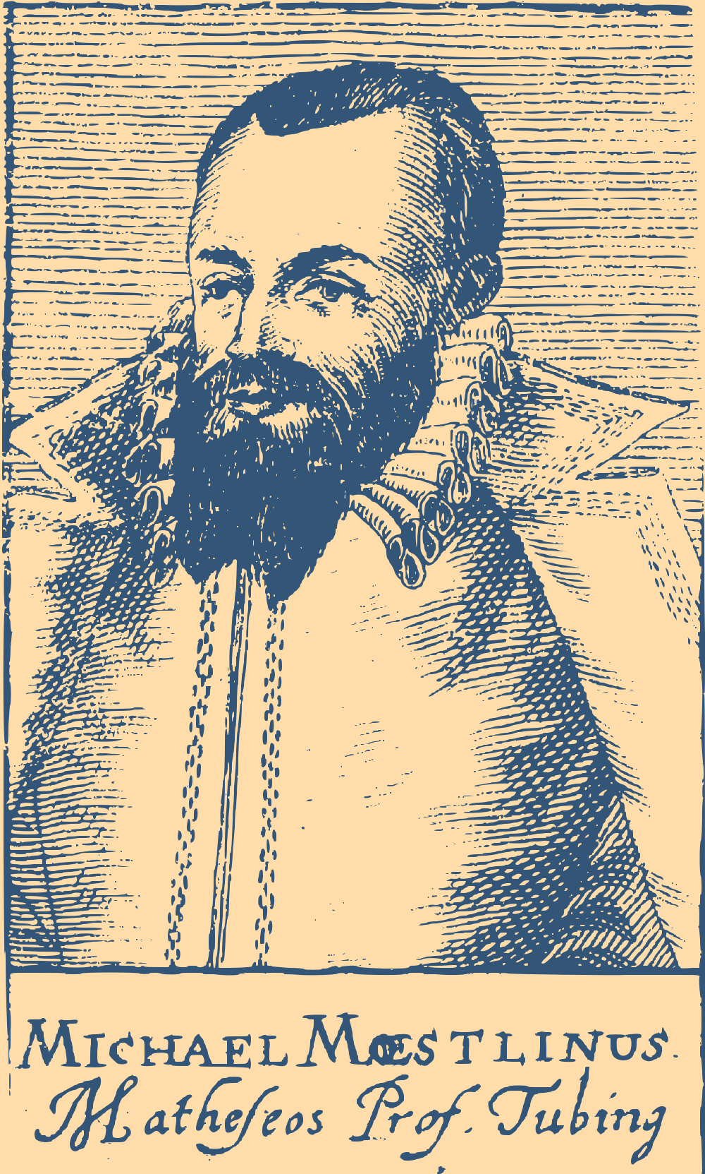 This features a portrait of Michael Maestlin, an astronomer and mathematician known for being the mentor of Johannes Kepler. He is depicted with a beard and mustache, wearing a robe and holding a book in his hand. The portrait is in black and white, giving it an old-fashioned appearance. The name "Michael Möstlinus" is written below the image, indicating that this is indeed a portrait of Michael Maestlin.