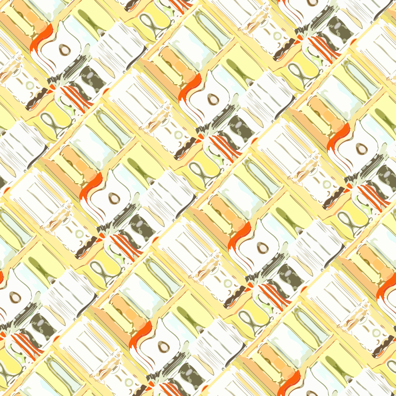 This features a pattern of various objects, including a train and a pair of scissors. The train is prominently displayed in the center of the pattern, surrounded by other items such as a cup, a bowl, and a spoon. There are also several books scattered throughout the pattern, with some placed near the top left corner, others in the middle right section, and a few more towards the bottom right side. The overall composition creates an interesting visual effect that combines different objects into one cohesive design.
